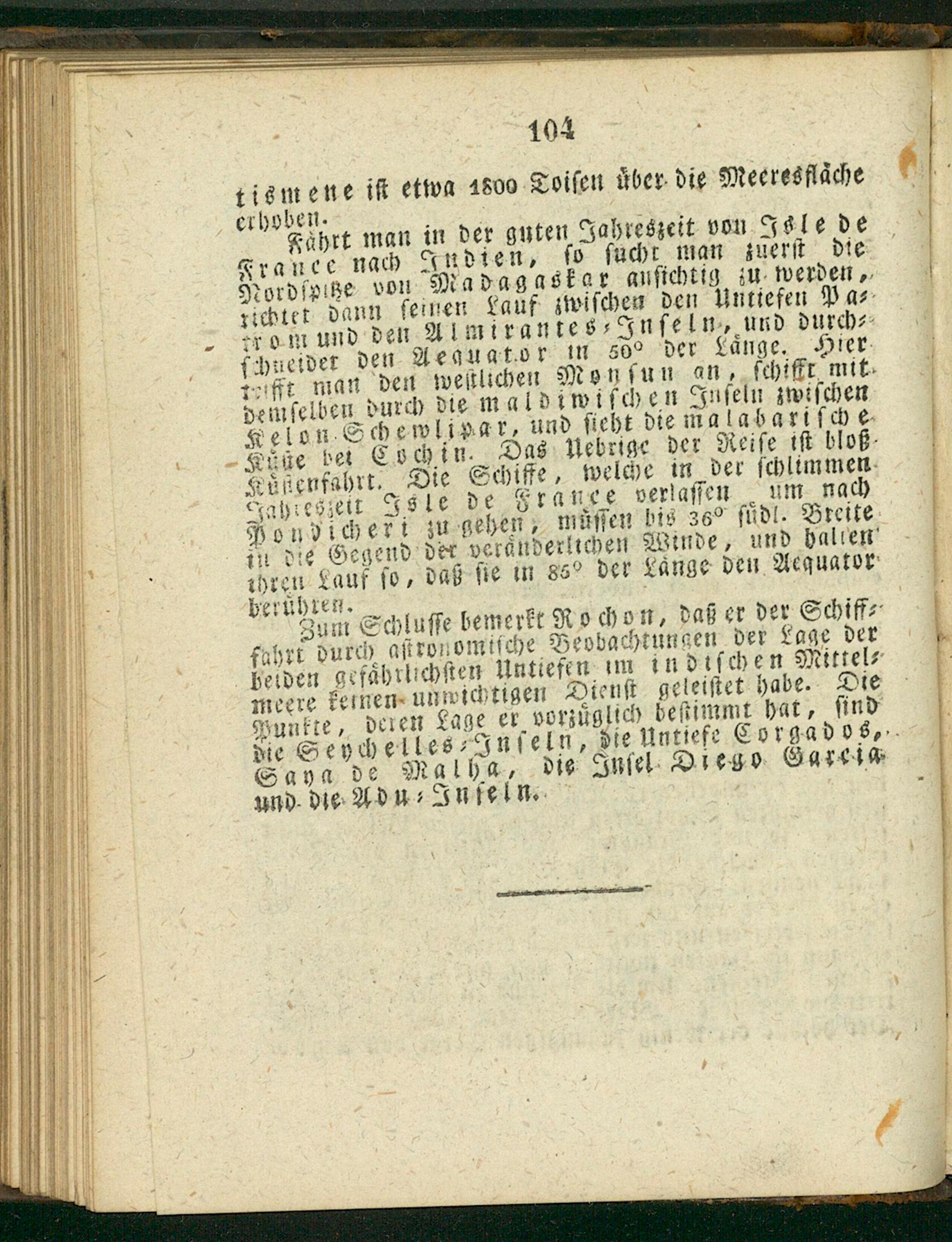 Faͤhrt man in der guten Jahreszeit von Islede Frauce nach Tudien, ſo ſucht man zuerſt die Nordſpitze von Madag askar anſichtig zu werden⸗ richtet dann ſeinen Lauf zwiſchen den Untiefen Pa⸗