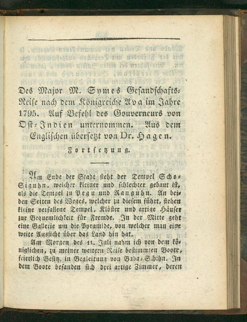 Des Major M. Symes Geſandſchafts⸗ nach dem Königreiche Ava im Jahre 1795. Auf Befehl des Gouverneurs von Oſt⸗Indien unternommen. Aus dem Engliſchen überſetzt von Dr. Hagen. Fo rtſeßun g.