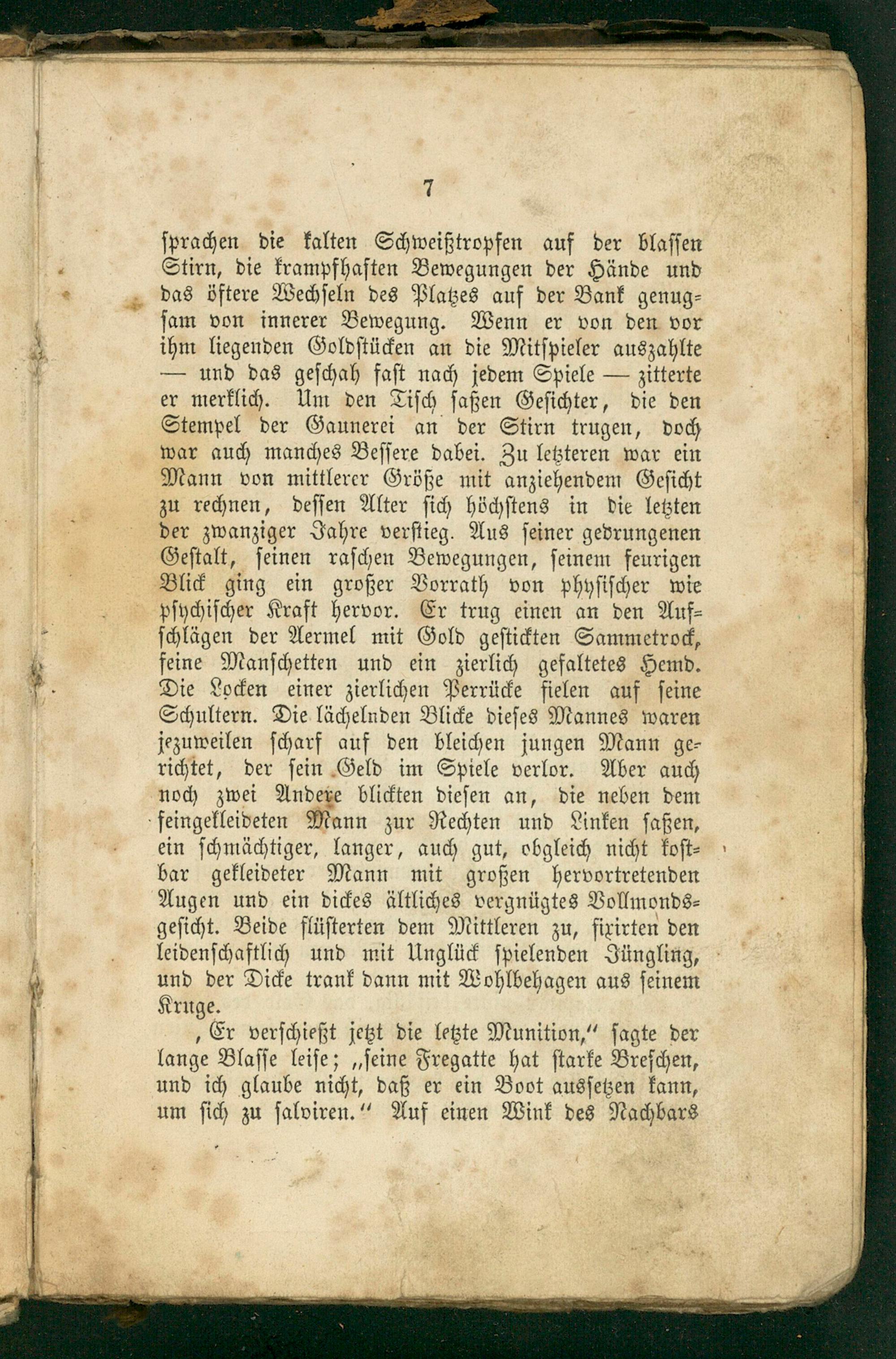 ſprachen die kalten Schweißtropfen auf der blaſſen Stirn, die krampfhaften Bewegungen der Hände und das öftere Wechſeln des Platzes auf der Bank genug⸗ ſam von innerer Bewegung. Wenn er von den vor ihm liegenden Goldſtücken an die Mitſpieler auszahlte — und das geſchah faſt nach jedem Spiele— zitterte er merklich. Um den Tiſch ſaßen Geſichter, die den Stempel der Gaunerei an der Stirn trugen, doch war auch manches Beſſere dabei. Zu letzteren war ein Mann von mittlerer Größe mit anziehendem Geſicht zu rechnen, deſſen Alter ſich höchſtens in die letzten der zwanziger Jahre verſtieg. Aus ſeiner gedrungenen Geſtalt, ſeinen raſchen Bewegungen, ſeinem feurigen Blick ging ein großer Vorrath von phhyſiſcher wie pſychiſcher Kraft hervor. Er trug einen an den Auf⸗ ſchlägen der Aermel mit Gold geſtickten Sammetrock, feine Manſchetten und ein zierlich gefaltetes Hemd. Die Locken einer zierlichen Perrücke fielen auf ſeine Schultern. Die lächelnden Blicke dieſes Mannes waren jezuweilen ſcharf auf den bleichen jungen Mann ge⸗ richtet, der ſein Geld im Spiele verlor. Aber auch noch zwei Andere blickten dieſen an, die neben dem