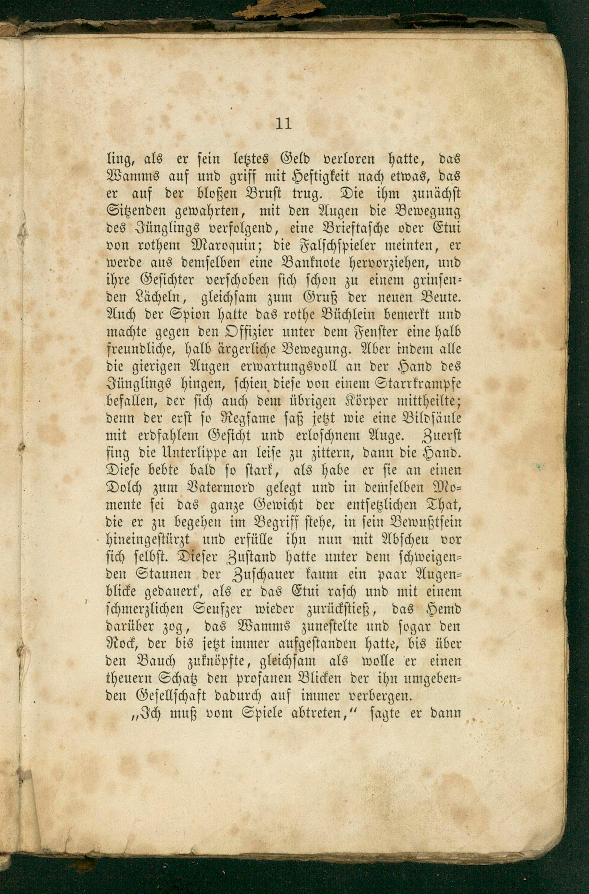 ling, als er ſein letztes Geld verloren hatte, das Wamms auf und griff mit Heftigkeit nach etwas, das er auf der bloßen Bruſt trug. Die ihm zunächſt Sitzenden gewahrten, mit den Augen die Bewegung des Jünglings verfolgend, eine Brieftaſche oder Etui von rothem Maroquin; die Falſchſpieler meinten, er werde aus demſelben eine Banknote hervorziehen, und ihre Geſichter verſchoben ſich ſchon zu einem grinſen⸗ den Lächeln, gleichſam zum Gruß der neuen Beute. Anch der Spion hatte das rothe Büchlein bemerkt und machte gegen den Offizier unter dem Fenſter eine halb ſreunüie halb ärgerliche Bewegung. Aber indem alle die gierigen Augen erwartungsvoll an der Hand des Zünglings hingen, ſchien dieſe von einem Starrkrampfe befallen, der ſich auch dem übrigen Körper mittheilte; denn der erſt ſo Regſame ſaß jetzt wie eine Bildſäule mit erdfahlem Geſicht und erloſchnem Auge. Zuerſt fing die Unterlippe an leiſe zu zittern, dann die Hand. Dieſe bebte bald ſo ſtark, als habe er ſie an einen Dolch zum Vatermord gelegt und in demſelben Mo⸗ mente ſei das ganze Gewicht der entſetzlichen That, die er zu begehen im Begriff ſtehe, in ſein Bewußtſein