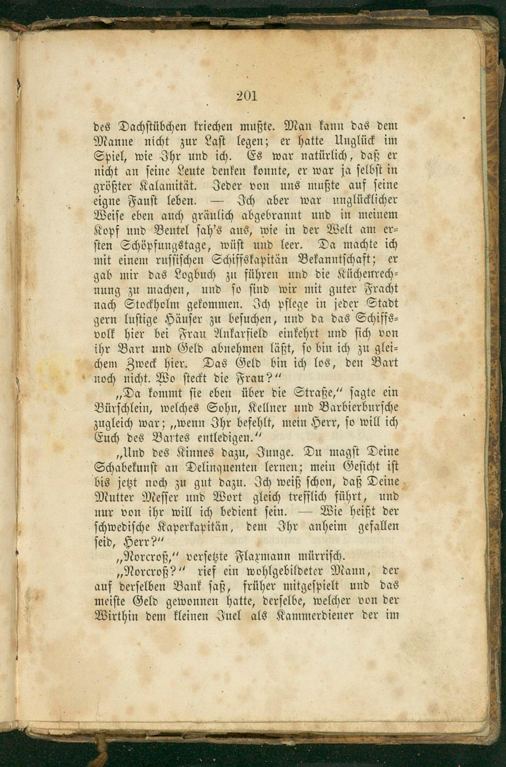 des Dachſtübchen kriechen mußte. Man kann das dem Manne nicht zur Laſt legen; er hatte Unglück im Spiel, wie Ihr und ich. Es war natürlich, daß er nicht an ſeine Leute denken konnte, er war ja ſelbſt in größter Kalamität. Jeder von uns mußte auf ſeine eigne Fauſt leben.— Ich aber war unglücklicher Weiſe eben auch gräulich abgebrannt und in meinem Kopf und Beutel ſah's aus, wie in der Welt am er⸗ ſten Schöpfungstage, wüſt und leer. Da machte ich mit einem ruſſiſchen Schiffskapitän Bekanntſchaft; er gab mir das Logbuch zu führen und die Küchenrech⸗ nung zu machen, und ſo ſind wir mit guter Fracht nach Stockholm gekommen. Ich pflege in jeder Stadt gern luſtige Häuſer zu beſuchen, und da das Schiffs⸗ volk hier bei Frau Ankarfield einkehrt und ſich von ihr Bart und Geld abnehmen läßt, ſo bin ich zu glei⸗ chem Zweck hier. Das Geld bin ich los, den Bart noch nicht. Wo ſteckt die Frau?“