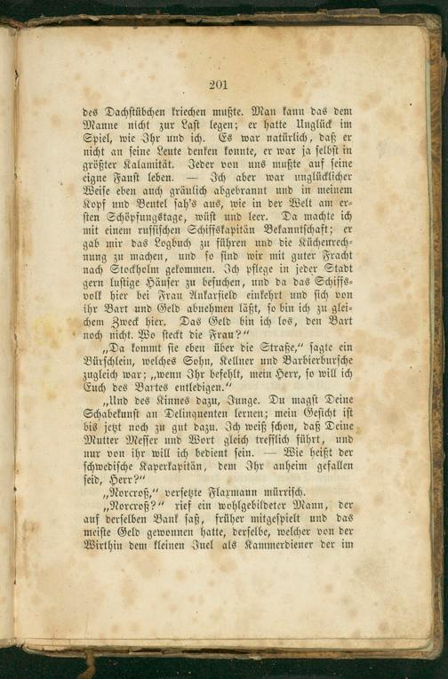 „Norcroß?“ rief ein wohlgebildeter Mann, der auf derſelben Bank ſaß, früher mitgeſpielt und das meiſte Geld gewonnen hatte, derſelbe, welcher von der Wirthin dem kleinen Juel als enſihethne der im