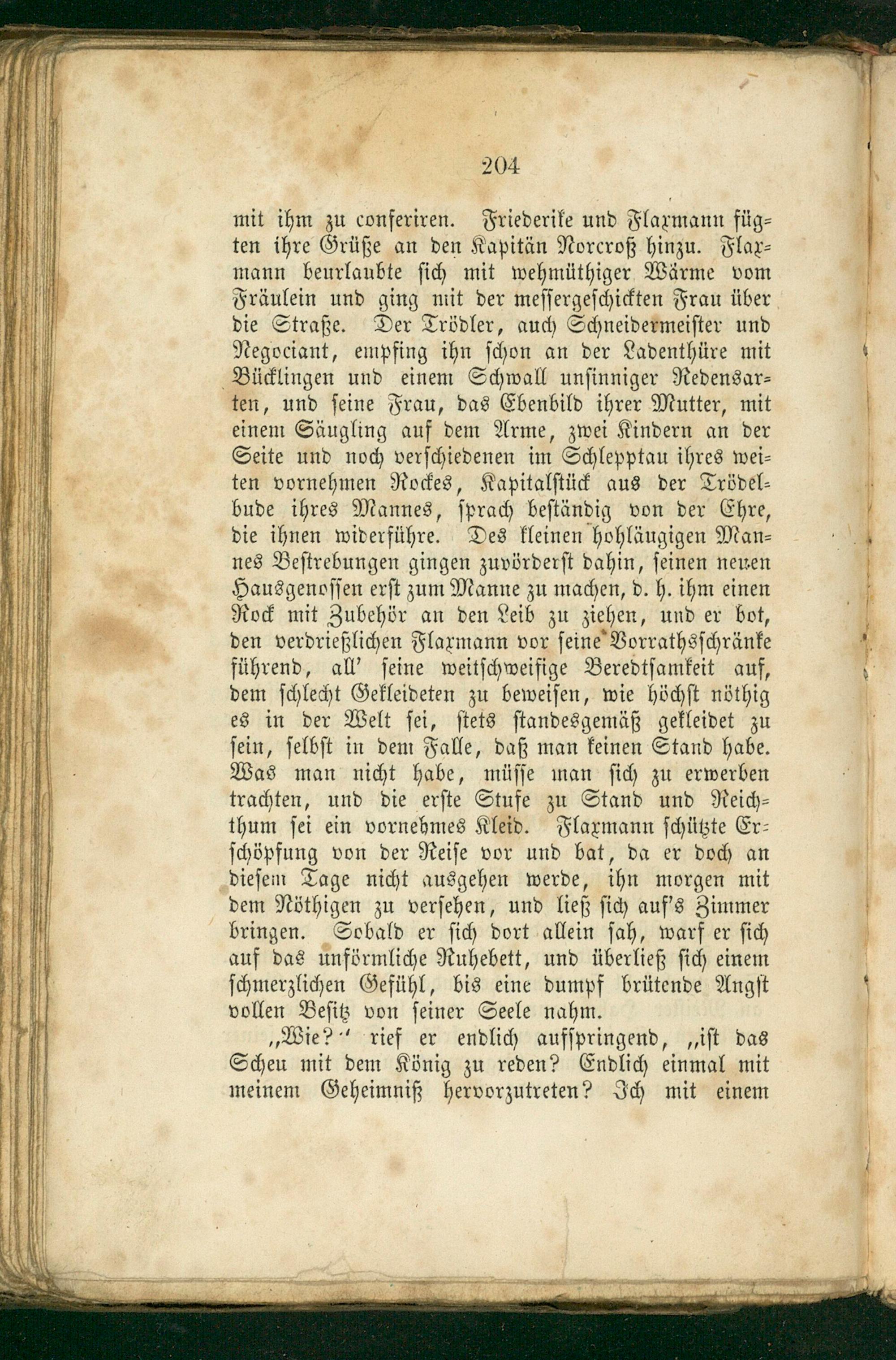 mit ihm zu conferiren. Friederike und Flaxmann füg⸗ ten ihre Grüße an den Kapitän Norcroß hinzu. Flax⸗ mann beurlaubte ſich mit wehmüthiger Wärme vom Fräulein und ging mit der meſſergeſchickten Frau über die Straße. Der Trödler, auch Schneidermeiſter und Negociant, empfing ihn ſchon an der Ladenthüre mit Bücklingen und einem Schwall unſinniger Redensar⸗ ten, und ſeine Frau, das Ebenbild ihrer Mutter, mit einem Säugling auf dem Arme, zwei Kindern an der Seite und noch verſchiedenen im Schlepptau ihres wei⸗ ten vornehmen Rockes, Kapitalſtück aus der Trödel⸗ bude ihres Mannes, ſprach beſtändig von der Ehre, die ihnen widerführe. Des kleinen hohläugigen Man⸗ nes Beſtrebungen gingen zuvörderſt dahin, ſeinen neuen Hausgenoſſen erſt zum Manne zu machen, d. h. ihm einen Rock mit Zubehör an den Leib zu ziehen, und er bot, den verdrießlichen Flaxmann vor ſeine Vorrathsſchränke führend, all' ſeine weitſchweifige Beredtſamkeit auf, dem ſchlecht Gekleideten zu beweiſen, wie höchſt nöthig es in der Welt ſei, ſtets ſtandesgemäß gekleidet zu ſein, ſelbſt in dem Falle, daß man keinen Stand habe. Was man nicht habe, müſſe man ſich zu erwerben trachten, und die erſte Stufe zu Stand und Reich⸗ thum ſei ein vornehmes Kleid. Flaxmann ſchützte Er⸗ ſchöpfung von der Reiſe vor und bat, da er doch an dieſem Tage nicht ausgehen werde, ihn morgen mit dem Nöthigen zu verſehen, und ließ ſich auf's Zimmer bringen. Sobald er ſich dort allein ſah, warf er ſich auf das unförmliche Ruhebett, und überließ ſich einem ſchmerzlichen Gefühl, bis eine dumpf brütende Angſt vollen Beſitz von ſeiner Seele nahm.