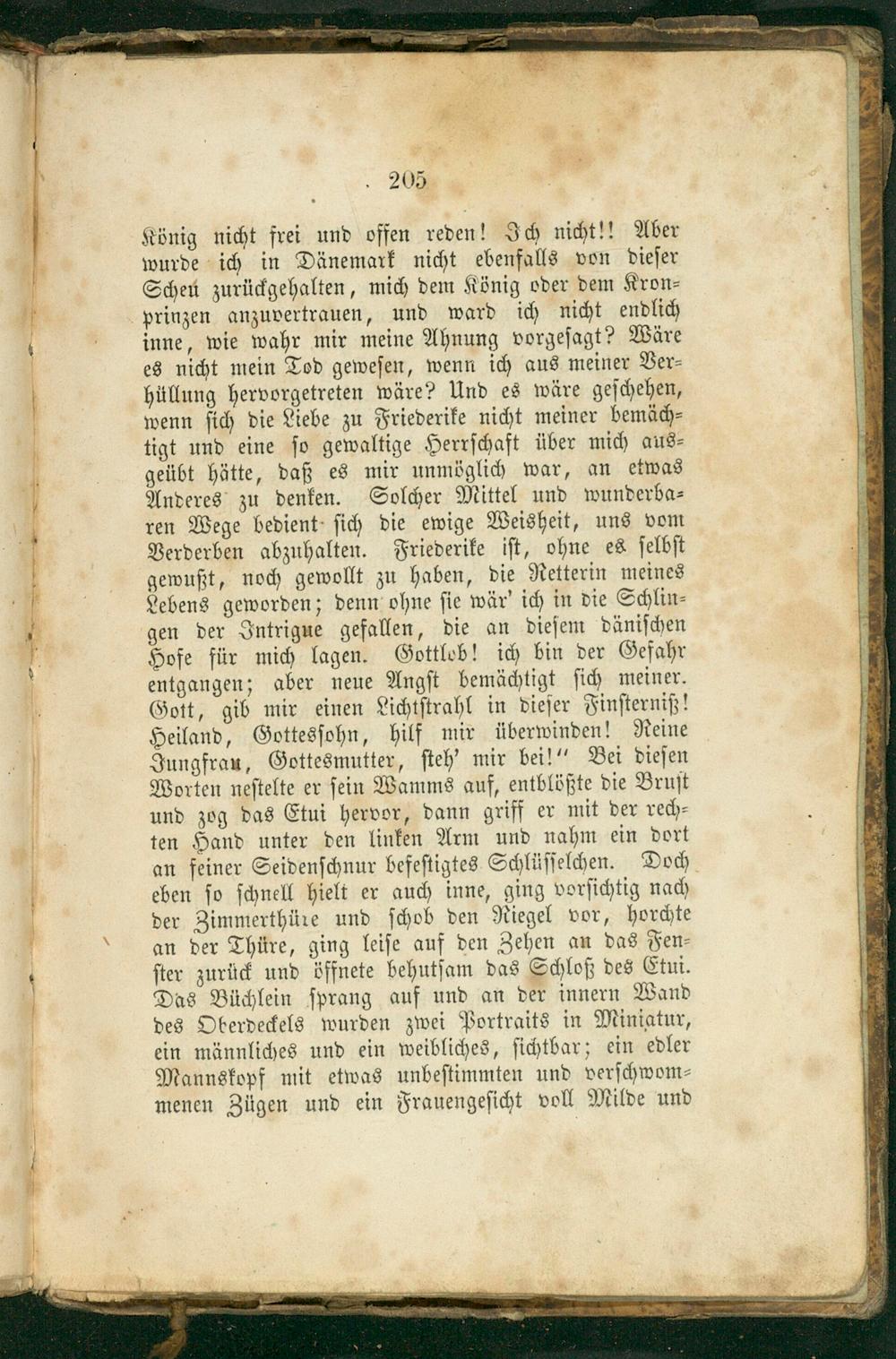 König nicht frei und offen reden! Ich nicht!! Aber wurde ich in Dänemark nicht ebenfalls von dieſer Scheu zurückgehalten, mich dem König oder dem Kron⸗ prinzen anzuvertrauen, und ward ich nicht endlich inne, wie wahr mir meine Ahnung vorgeſagt? Wäre es nicht mein Tod geweſen, wenn ich aus meiner Ver⸗ hüllung hervorgetreten wäre? Und es wäre geſchehen, wenn ſich die Liebe zu Friederike nicht meiner bemäch⸗ tigt und eine ſo gewaltige Herrſchaft über mich aus⸗ geübt hätte, daß es mir unmöglich war, an etwas Anderes zu denken. Solcher Mittel und wunderba⸗ ren Wege bedient ſich die ewige Weisheit, uns vom Verderben abzuhalten. Friederike iſt, ohne es ſelbſt gewußt, noch gewollt zu haben, die Retterin meines Lebens geworden; denn ohne ſie wär' ich in die Schlin⸗ gen der Intrigue gefallen, die an dieſem däniſchen Hofe für mich lagen. Gottlob! ich bin der Gefahr entgangen; aber neue Angſt bemächtigt ſich meiner. Gott, gib mir einen Lichtſtrahl in dieſer Finſterniß! Heiland, Gottesſohn, hilf mir überwinden! Reine Jungfrau, Gottesmutter, ſteh' mir bei!“ Bei dieſen Worten neſtelte er ſein Wamms auf, entblößte die Bruſt und zog das Etui hervor, dann griff er mit der rech⸗ ten Hand unter den linken Arm und nahm ein dort an feiner Seidenſchnur befeſtigtes Schlüſſelchen. Doch eben ſo ſchnell hielt er auch inne, ging vorſichtig nach der Zimmerthüre und ſchob den Riegel vor, horchte an der Thüre, ging leiſe auf den Zehen an das Fen⸗ ſter zurück und öffnete behutſam das Schloß des Etui. Das Büchlein ſprang auf und an der innern Wand des Okerdeckels wurden zwei Portraits in Miniatur, ein männliches und ein weibliches, ſichtbar; ein edler Mannskopf mit etwas unbeſtimmten und verſchwom⸗ menen Zügen und ein Frauengeſicht voll Milde und