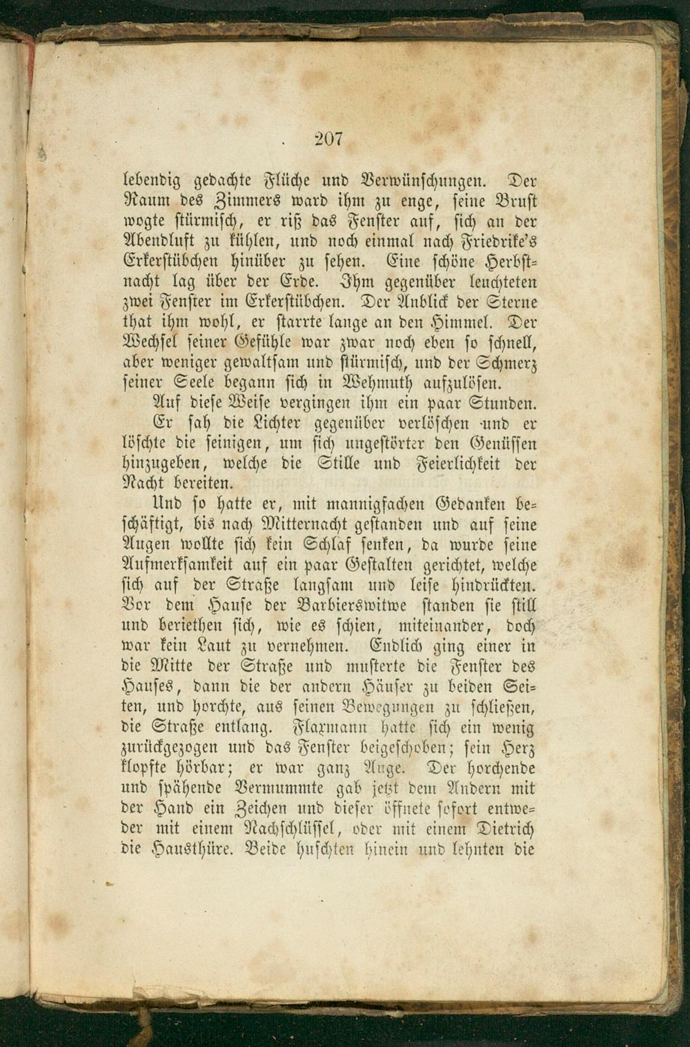 lebendig gedachte Flüche und Verwünſchungen. Der Raum des Zimmers ward ihm zu enge, ſeine Bruſt wogte ſtürmiſch, er riß das Fenſter auf, ſich an der Abendluft zu kühlen, und noch einmal nach Friedrike's Erkerſtübchen hinüber zu ſehen. Eine ſchöne Herbſt⸗ nacht lag über der Erde. Ihm gegenüber leuchteten zwei Fenſter im Erkerſtübchen. Der Anblick der Sterne that ihm wohl, er ſtarrte lange an den Himmel. Der Wechſel ſeiner Gefühle war zwar noch eben ſo ſchnell, aber weniger gewaltſam und ſtürmiſch, und der Schmerz ſeiner Seele begann ſich in Wehmuth aufzulöſen.