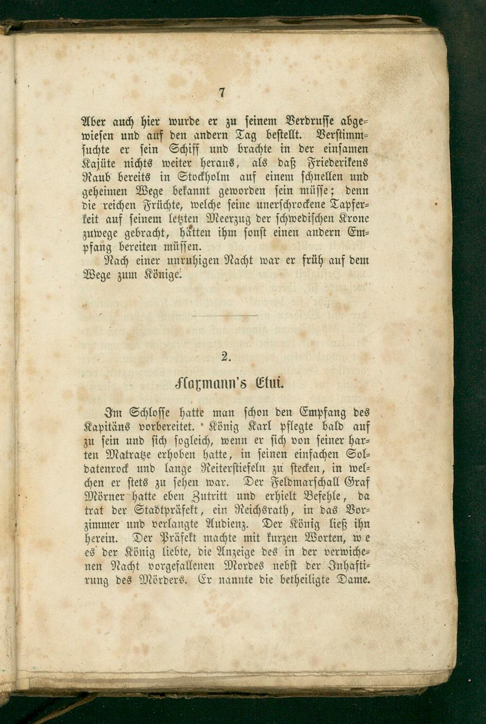 Im Schloſſe hatte man ſchon den Empfang des Kapitäns vorbereitet. König Karl pflegte bald auf zu ſein und ſich ſogleich, wenn er ſich von ſeiner har⸗ ten Matratze erhoben hatte, in ſeinen einfachen Sol⸗ datenrock und lange Reiterſtiefeln zu ſtecken, in wel⸗ chen er ſtets zu ſehen war. Der Feldmarſchall Graf Mörner hatte eben Zutritt und erhielt Befehle, da trat der Stadtpräfekt, ein Reichsrath, in das Vor⸗ zimmer und verlangte Audienz. Der König ließ ihn herein. Der Präfekt machte mit kurzen Worten, we es der König liebte, die Anzeige des in der verwiche⸗ nen Nacht vorgefallenen Mordes nebſt der Inhafti⸗ rung des Mörders. Er nannte die betheiligte Dame.