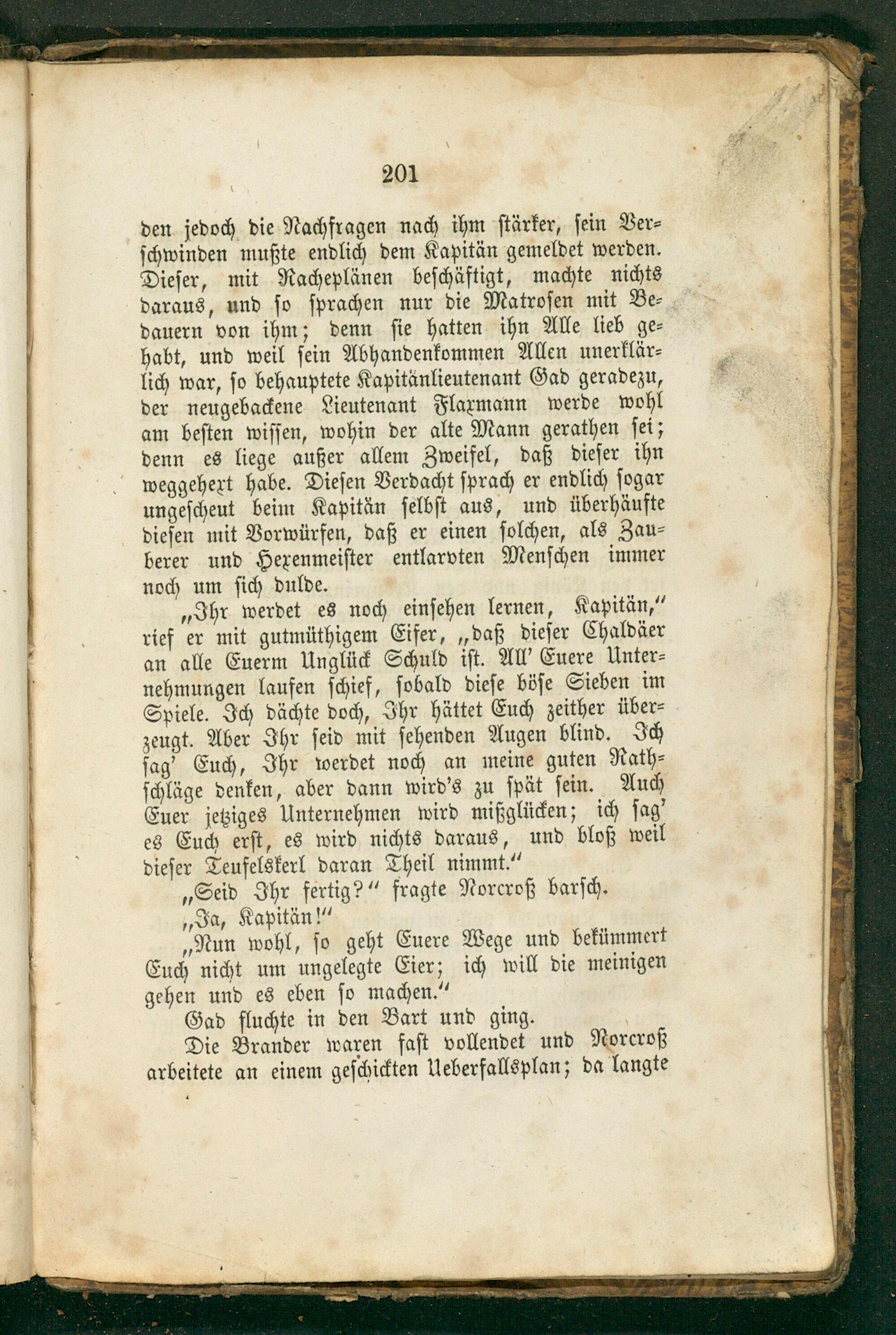 den jedoch die Nachfragen nach ihm ſtärker, ſein Ver⸗ ſchwinden mußte endlich dem Kapitän gemeldet werden. Dieſer, mit Racheplänen beſchäftigt, machte nichts daraus, und ſo ſprachen nur die Matroſen mit Be⸗ dauern von ihm; denn ſie hatten ihn Alle lieb ge⸗ habt, und weil ſein Abhandenkommen Allen unerklär⸗ lich war, ſo behauptete Kapitänlieutenant Gad geradezu, der neugebackene Lieutenant Flarmann werde wohl am beſten wiſſen, wohin der alte Mann gerathen ſei; denn es liege außer allem Zweifel, daß dieſer ihn weggehert habe. Dieſen Verdacht ſprach er endlich ſogar ungeſcheut beim Kapitän ſelbſt aus, und überhäufte dieſen mit Vorwürfen, daß er einen ſolchen, als Zau⸗ berer und Herenmeiſter entlarvten Menſchen immer noch um ſich dulde.