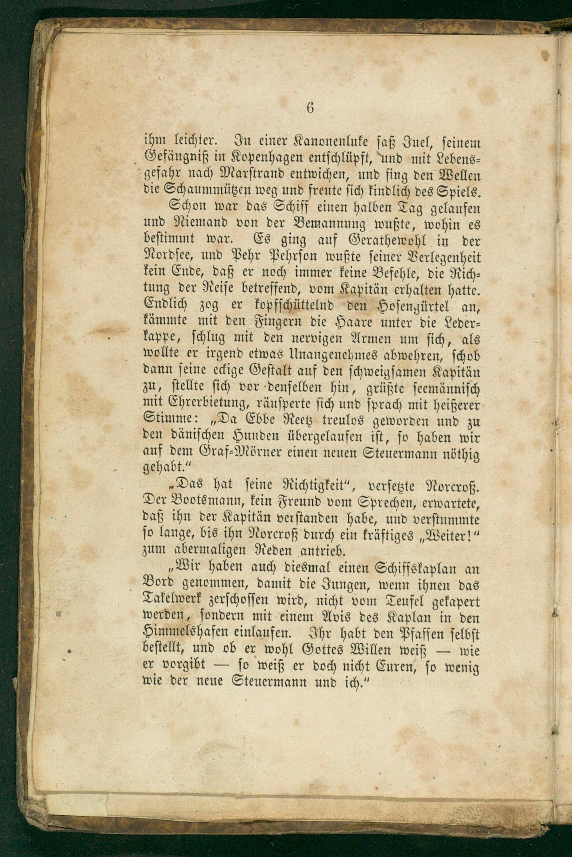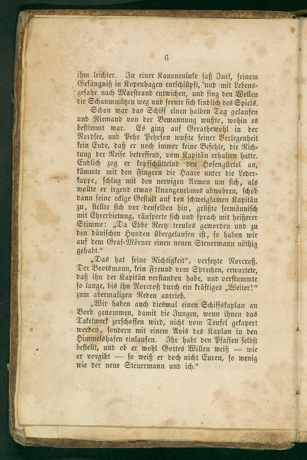 Schon war das Schiff einen halben Tag gelaufen und Niemand von der Bemannung wußte, wohin es beſtimmt war. Es ging auf Gerathewohl in der Nordſee, und Pehr Pehrſon wußte ſeiner Verlegenheit kein Ende, daß er noch immer keine Befehle, die Rich⸗ tung der Reiſe betreffend, vom Kapitän erhalten hatte. Endlich zog er kopfſchüttelnd den Hoſenzürtel an, kämmte mit den Fingern die Haare unter die Leder⸗ kappe, ſchlug mit den nervigen Armen um ſich, als wollte er irgend etwas Unangenehmes abwehren, ſchob dann ſeine eckige Geſtalt auf den ſchweigſamen Kapitän zu, ſtellte ſich vor denſelben hin, grüßte ſeemänniſch mit Ehrerbietung, räuſperte ſich und ſprach mit heißerer Stimme:„Da Ebbe Reetz treulos geworden und zu den däniſchen Hunden übergelaufen iſt, ſo haben wir auf dem Graf⸗Mörner einen neuen Steuermann nöthig gehabt.“