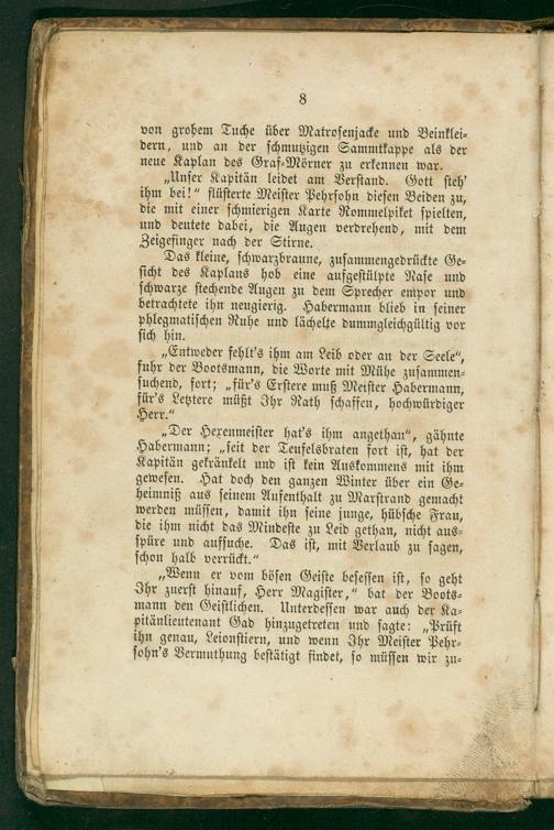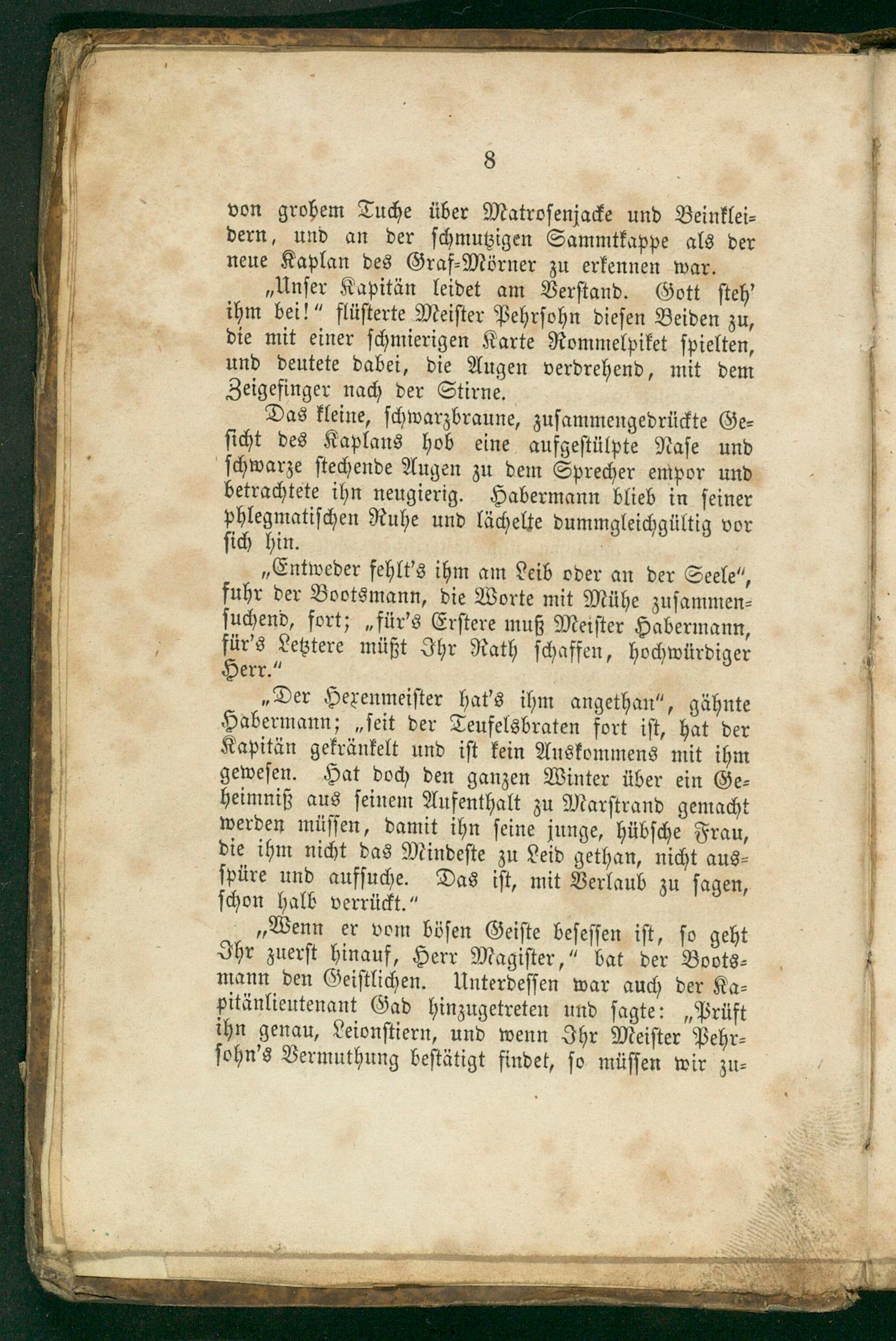 „Unſer Kapitän leidet am Verſtand. Gott ſteh' ihm bei!“ flüſterte Meiſter Pehrſohn dieſen Beiden zu, die mit einer ſchmierigen Karte Rommelpiket ſpielten, und deutete dabei, die Augen verdrehend, mit dem Zeigefinger nach der Stirne.