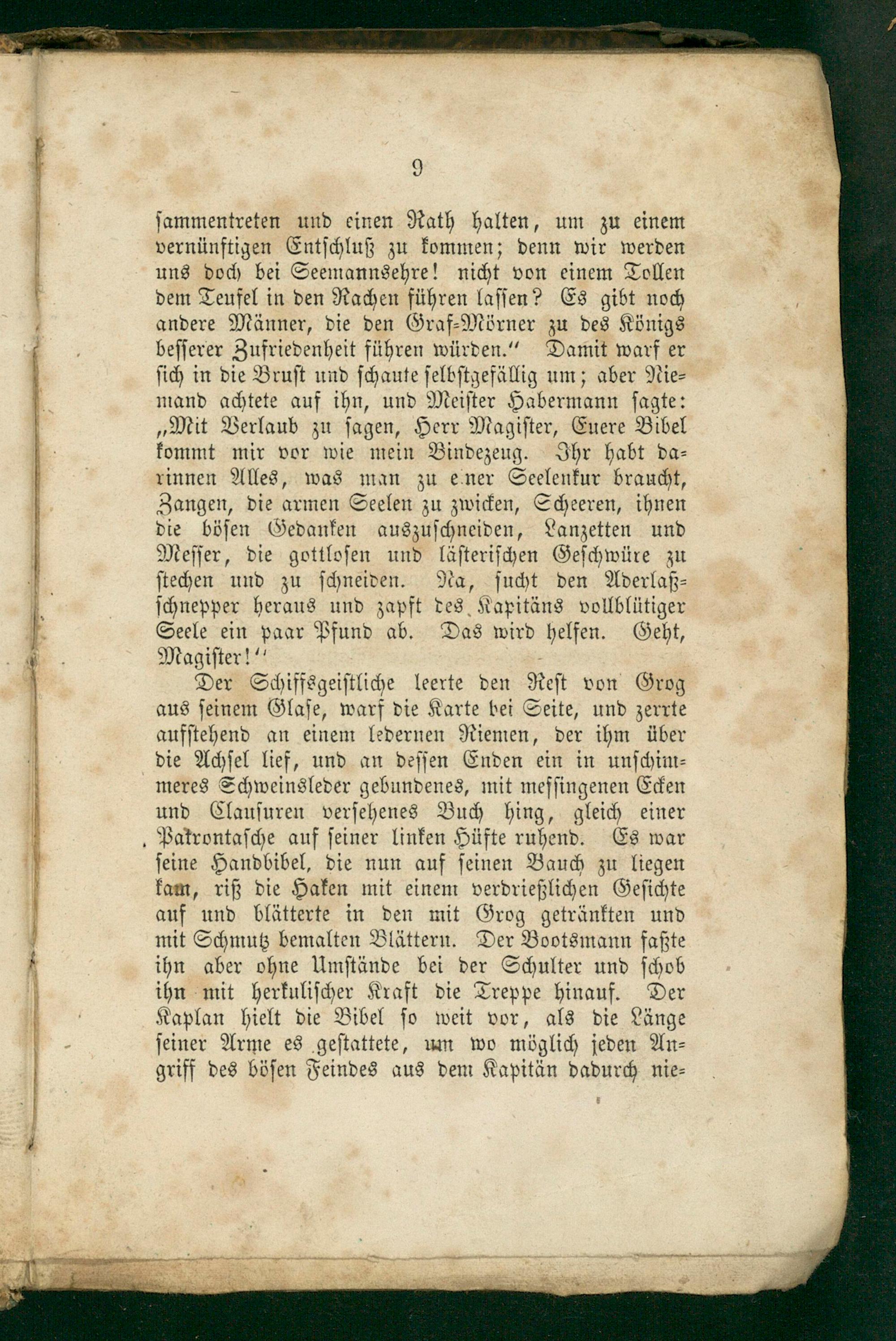 ſeine Handbibel, die nun auf ſeinen Bauch zu liegen kam, riß die Haken mit einem verdrießlichen Geſichte auf und blätterte in den mit Grog getränkten und mit Schmutz bemalten Blättern. Der Bootsmann faßte ihn aber ohne Umſtände bei der Schulter und ſchob ihn mit herkuliſcher Kraft die Treppe hinauf. Der Kaplan hielt die Bibel ſo weit vor, als die Länge ſeiner Arme es geſtattete, um wo möglich jeden An⸗ griff des böſen Feindes aus dem Kapitän dadurch nie⸗