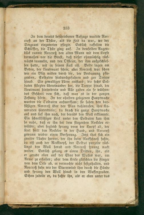 In dem bereits beſchriebenen Aufzuge wartete Nor⸗ croß an der Thüre, als die Zeit da war, wo der Sergeant einzutreten pflegte. Endlich raſſelten die Schlöſſer, die Thür ging auf. In demſelben Augen⸗ blick rannte Norcroß den alten Mann mit dem Kopfe dermaßen vor die Bruſt, daß dieſer ohnmächtig rück⸗ wärts taumelte, und den Officier, der ihm aufgeſchloſ⸗ ſen hatte, mit in ſeinen Fall riß. Beide lagen am Boden, der Lieutenant ſchrie, aber Norcroß war ſchon wie ein Blitz mitten durch die, der Verdauung pfle⸗ genden, Soldaten hindurchgefahren und zur Treppe hinab. Ein gewaltiger Lärm entſtand; die ſechs Sol⸗ daten ſtürzten übereinander her, die Treppe hinab, der Lieutenant hinterdrein und Alle gaben ein ſo wüthen⸗ des Geſchrei von ſich, daß man es in der ganzen Feſtung hörte. In der ohnfern gelegenen Hauptwache wurden die Soldaten aufmerkſam; ſie ſahen den bar⸗ füßigen Norcroß über den Plan dahinraſen, ihre Ka⸗
