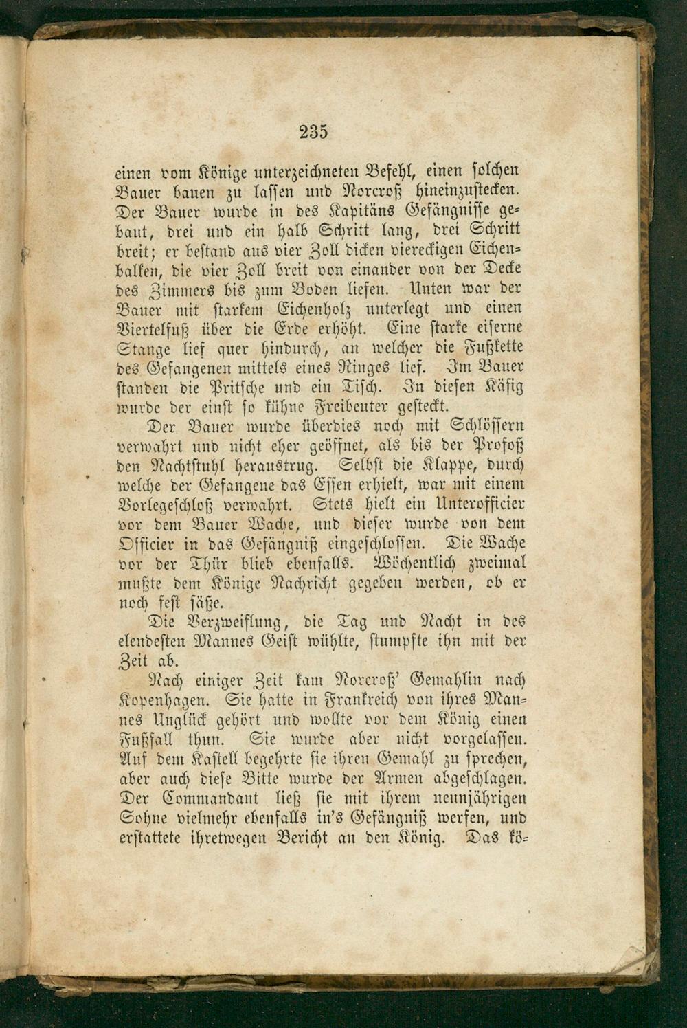 Nach einiger Zeit kam Norcroß' Gemahlin nach Kopenhagen. Sie hatte in Frankreich von ihres Man⸗ nes Unglück gehört und wollte vor dem König einen Fußfall thun. Sie wurde aber nicht vorgelaſſen. Auf dem Kaſtell begehrte ſie ihren Gemahl zu ſprechen, aber auch dieſe Bitte wurde der Armen abgeſchlagen. Der Commandant ließ ſie mit ihrem neunjährigen Sohne vielmehr ebenfalls in's Gefängniß werfen, und erſtattete ihretwegen Bericht an den König. Das kö⸗