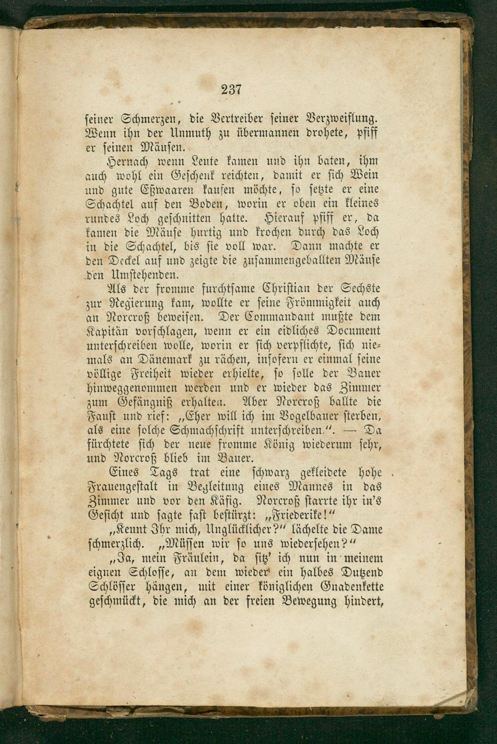 an Norcroß beweiſen. Der Commandant mußte dem Kapitän vorſchlagen, wenn er ein eidliches Document unterſchreiben wolle, worin er ſich rerpfichte ſich nie⸗ mals an Dänemark zu rächen, inſofern er einmal ſeine völlige Freiheit wieder erhielte, ſo ſolle der Bauer hinweggenommen werden und er das Zimmer zum Gefängniß erhalten. Aber Norcroß ballte die Fauſt und rief:„Eher will ich im Vogelbauer ſterben, als eine ſolche Schmachſchrift unterſchreiben“.— Da fürchtete ſich der neue fromme König wiederum ſehr, und Norcroß blieb im Bauer.