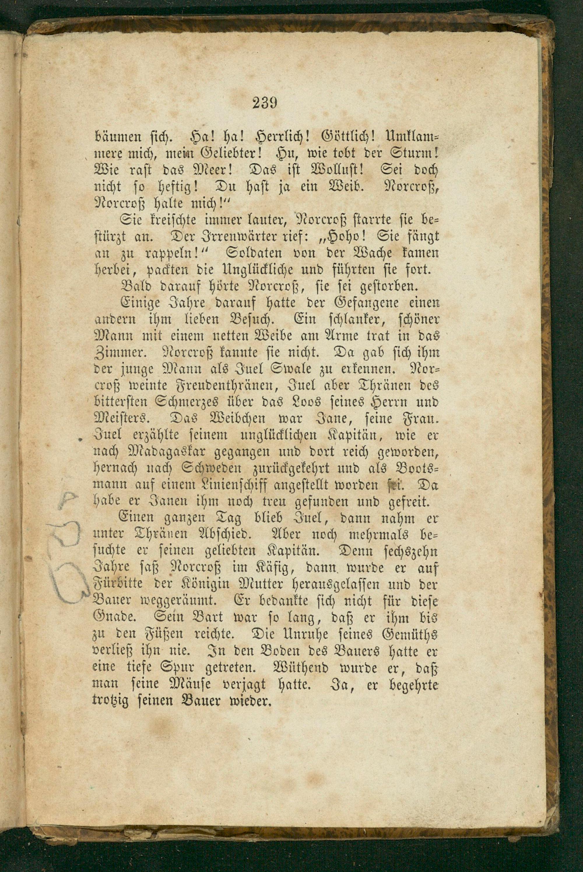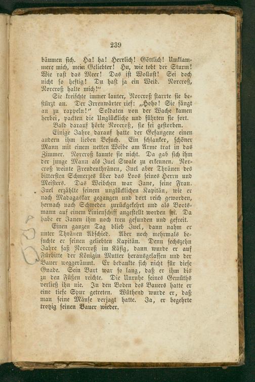 Einige Jahre darauf hatte der Gefangene einen andern ihm lieben Beſuch. Ein ſchlanker, ſchöner Mann mit einem netten Weibe am Arme trat in das Zimmer. erß kannte ſie nicht. Da gab ſich ihm der junge Mann als Juel Swale zu erkennen. Nor⸗ croß weinte Freudenthränen, Juel aber Thränen des bitterſten Schmerzes über das Loos ſeines Herrn und Meiſters. Das Weibchen war Jane, ſeine Frau. Juel erzählte ſeinem unglücklichen Kapitän, wie er nach Madagaskar gegangen und dort reich geworden, hernach nach Schweden zurückgekehrt und als. mann auf einem Linienſchiff angeſtellt worden ſei. habe er Janen ihm noch treu gefunden und