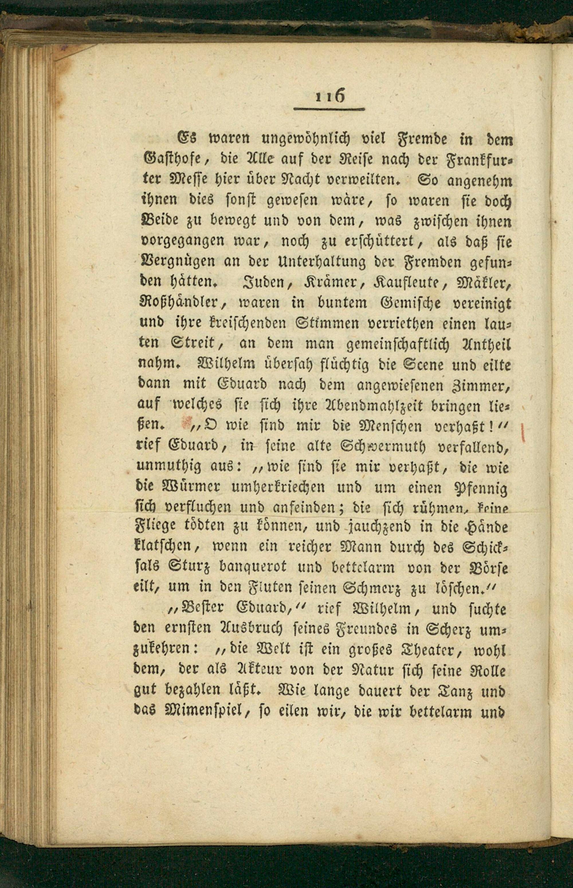 Es waren ungewoͤhnlich viel Fremde in dem Gaſthofe, die Alle auf der Reiſe nach der Frankfur⸗ ter Meſſe hier uͤber Nacht verweilten. So angenehm ihnen dies ſonſt geweſen waͤre, ſo waren ſie doch Beide zu bewegt und von dem, was zwiſchen ihnen vorgegangen war, noch zu erſchuͤttert, als daß ſie Vergnuͤgen an der Unterhaltung der Fremden gefun⸗ den hätten. Juden, Kraͤmer, Kaufleute, Mäkler, Roßhändler, waren in buntem Gemiſche vereinigt und ihre kreiſchenden Stimmen verriethen einen lau⸗ ten Streit, an dem man gemeinſchaftlich Antheil nahm. Wilhelm uͤberſah fluͤchtig die Scene und eilte dann mit Eduard nach dem angewieſenen Zimmer,