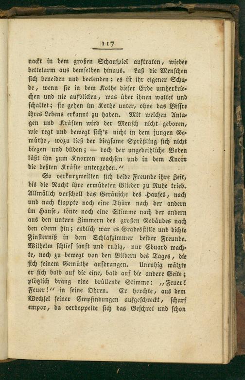 So verkurzweilten ſich beide Freunde ihre geit, bis die Nacht ihre ermuͤdeten Glieder zu Ruhe trieb. Allmälich verſcholl das Geräuſche des Hauſes, nach und nach klappte noch eine Thuͤre nach der andern im Hauſe, tonte noch eine Stimme nach der andern aus den untern Zimmern des großen Gebäudes nach den obern hin; endlich war es Grabesſtille und dichte Finſterniß in dem Schlafzimmer beider Freunde. Wilhelm ſchlief ſanft und ruhig, nur Eduard wach⸗ te, noch zu bewegt von den Bildern des Tages, die ſich ſeinem Gemuͤthe aufdrangen. unruhig wälzte er ſich bald auf die eine, bald auf die andere Seite; plotzlich drang eine bruͤllende Stimme:„ Feuer! Feuer!“ in ſeine Ohren. Er horchte, aus dem Wechſel ſeiner Empfindungen aufgeſchreckt, ſcharf empor, da verdoppelte ſich das Geſchrei und ſchon