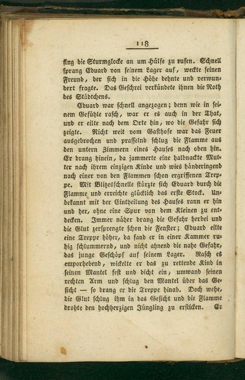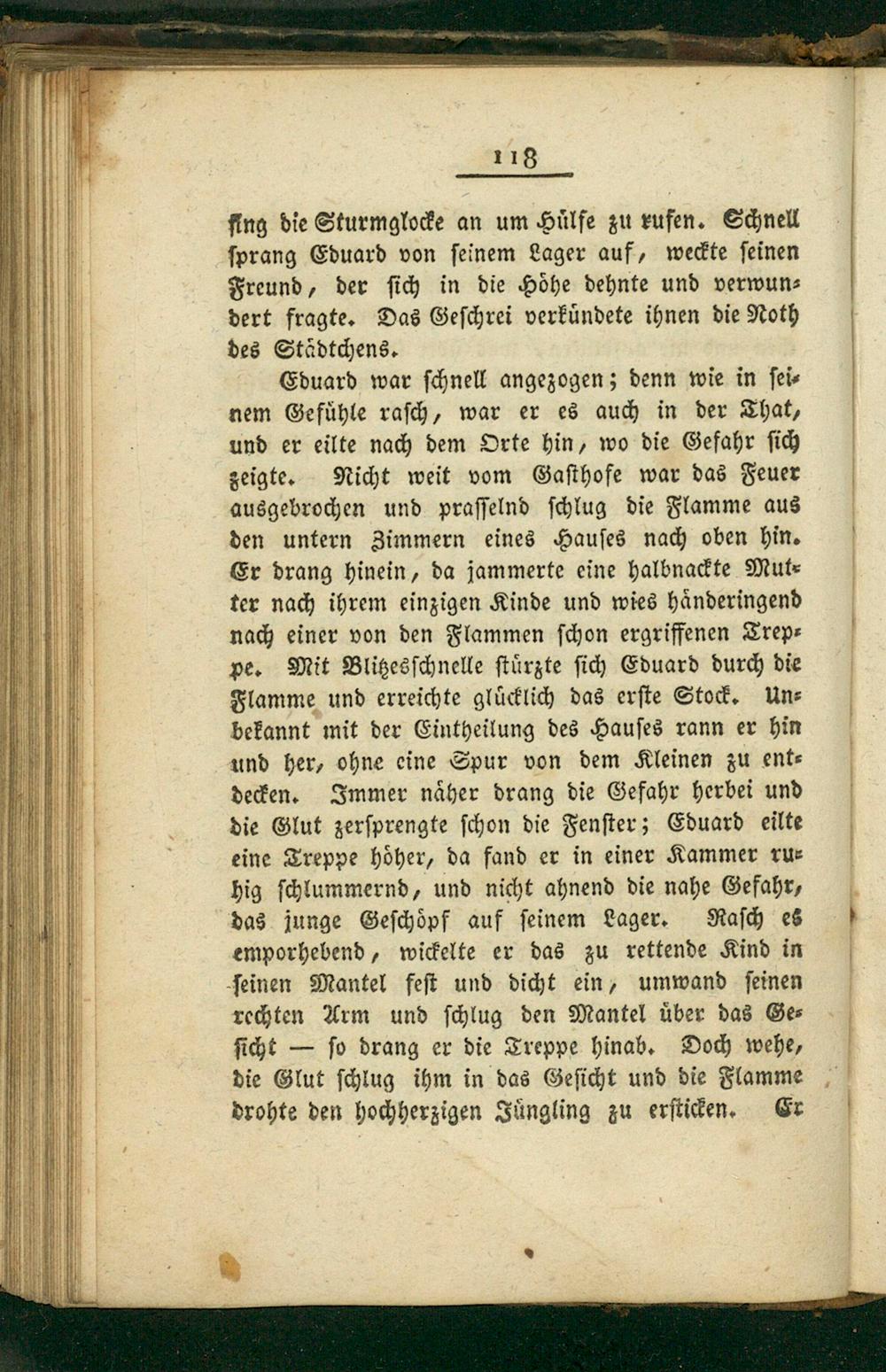 Eduard war ſchnell angezogen; denn wie in ſei⸗ nem Gefuͤhle raſch, war er es auch in der That, und er eilte nach dem Orte hin, wo die Gefahr ſich zeigte. Nicht weit vom Gaſthofe war das Feuer ausgebrochen und praſſelnd ſchlug die Flamme aus den untern Zimmern eines Hauſes nach oben hin. Er drang hinein, da jammerte eine halbnackte Mut⸗ ter nach ihrem einzigen Kinde und wies haͤnderingend nach einer von den Flammen ſchon ergriffenen Trep⸗ pe. Mit Blitzesſchnelle ſtuͤrzte ſich Eduard durch die Flamme und erreichte gluͤcklich das erſte Stock. Un⸗ bekannt mit der Eintheilung des Hauſes rann er hin und her, ohne eine Spur von dem Kleinen zu ent⸗ decken. Immer naͤher drang die Gefahr herbei und die Glut zerſprengte ſchon die Fenſter; Eduard eilte eine Treppe hoͤher, da fand er in einer Kammer ru⸗ hig ſchlummernd, und nicht ahnend die nahe Gefahr, das junge Geſchoͤpf auf ſeinem Lager. Raſch es emporhebend, wickelte er das zu rettende Kind in ſeinen Mantel feſt und dicht ein, umwand ſeinen rechten Arm und ſchlug den Mantel uͤber das Ge⸗ ſicht— ſo drang er die Treppe hinab. Doch wehe,