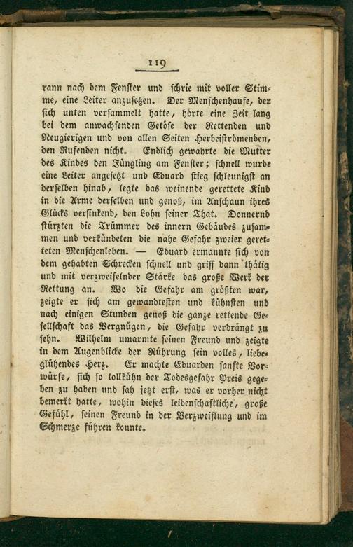 rann nach dem Fenſter und ſchrie mit voller Stim⸗ me, eine Leiter anzuſetzen. Der Menſchenhaufe, der ſich unten verſammelt hatte, hoͤrte eine Zeit lang bei dem anwachſenden Getoͤſe der Rettenden und Neugierigen und von allen Seiten Herbeiſtroͤmenden, den Rufenden nicht. Endlich gewahrte die Mutter des Kindes den Juͤngling am Fenſter; ſchnell wurde eine Leiter angeſetzt und Eduard ſtieg ſchleunigſt an derſelben hinab, legte das weinende gerettete Kind in die Arme derſelben und genoß, im Anſchaun ihres Gluͤcks verſinkend, den Lohn ſeiner That. Donnernd ſtuͤrzten die Trümmer des innern Gebaͤudes zuſam⸗ men und verkuͤndeten die nahe Gefahr zweier geret⸗ teten Menſchenleben.— Eduard ermannte ſich von dem gehabten Schrecken ſchnell und griff dann thätig und mit verzweifelnder Staͤrke das große Werk der Rettung an. Wo die Gefahr am groͤßten war, zeigte er ſich am gewandteſten und kuͤhnſten und nach einigen Stunden genoß die ganze rettende Ge⸗ ſellſchaft das Vergnuͤgen, die Gefahr verdraͤngt zu ſehn. Wilhelm umarmte ſeinen Freund und zeigte in dem Augenblicke der Ruͤhrung ſein volles, liebe⸗ glühendes Herz. Er machte Eduarden ſanfte Vor⸗ würfe, ſich ſo tollkuͤhn der Todesgefahr Preis gege⸗ ben zu haben und ſah jetzt erſt, was er vorher nicht bemerkt hatte, wohin dieſes leidenſchaftliche, große Gefuͤhl, ſeinen Freund in der Verzweiflung und im Schmerze fuͤhren konnte.