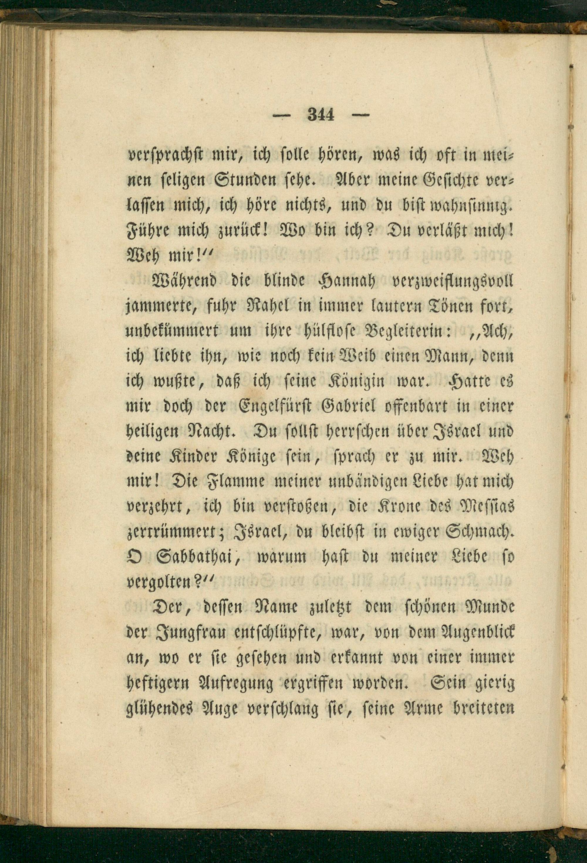 Während die blinde Hannah verzweiflungsvoll jammerte, fuhr Rahel in immer lautern Tönen fort, unbeküͤmmert um ihre hülfloſe Begleiterin:„Ach, ich liebte ihn, wie noch kein Weib einen Mann, denn ich wußte, daß ich ſeine Königin war. Hatte es mir doch der Engelfürſt Gabriel offenbart in einer heiligen Nacht. Du ſollſt herrſchen über Israel und deine Kinder Könige ſein, ſprach er zu mir. Weh mir! Die Flamme meiner unbändigen Liebe hat mich verzehrt, ich bin verſtoßen, die Krone des Meſſias zertrümmert; Israel, du bleibſt in ewiger Schmach. O Sabbathai, warum haſt du meiner Liebe ſo vergolten?“