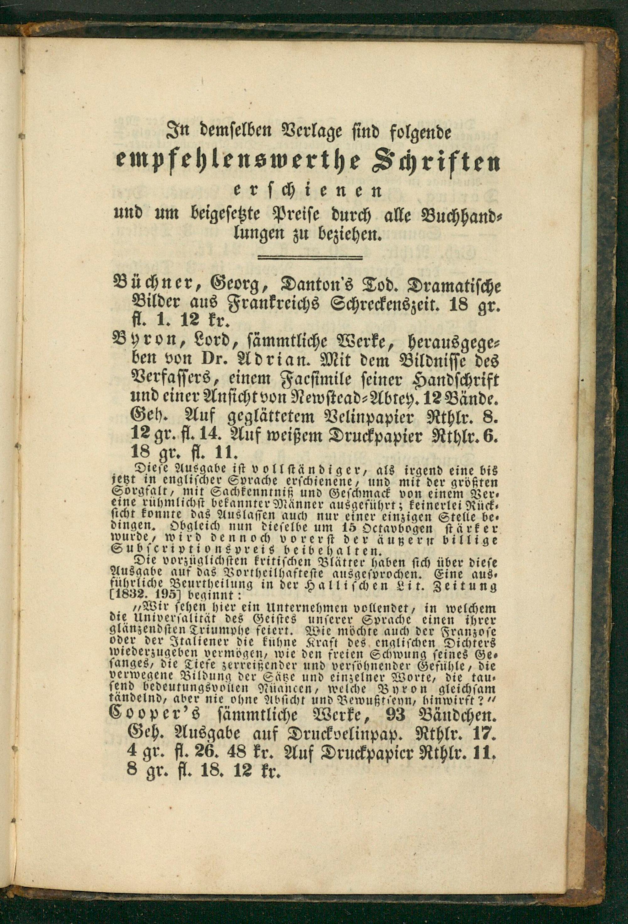 Die vorzüglichſten kritiſchen Blätter haben ſich über dieſe Ausgabe auf das Portheilhafteſte ausgeſprochen. Eine aus⸗ führliche Beurtheilung in der Halliſchen Lit. Zeitung [1832. 195) beginnt: