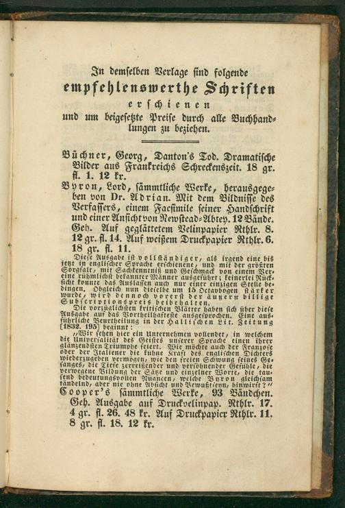 Cooper's ſämmtliche Werke, 93 Bändchen. Geh. Ausgabe auf Druckvelinpap. Rthlr. 17. 4 gr. fl. 26. 48 kr. Auf Druckpapier Rthlr. 11. 8 Zr. f 18 12 k