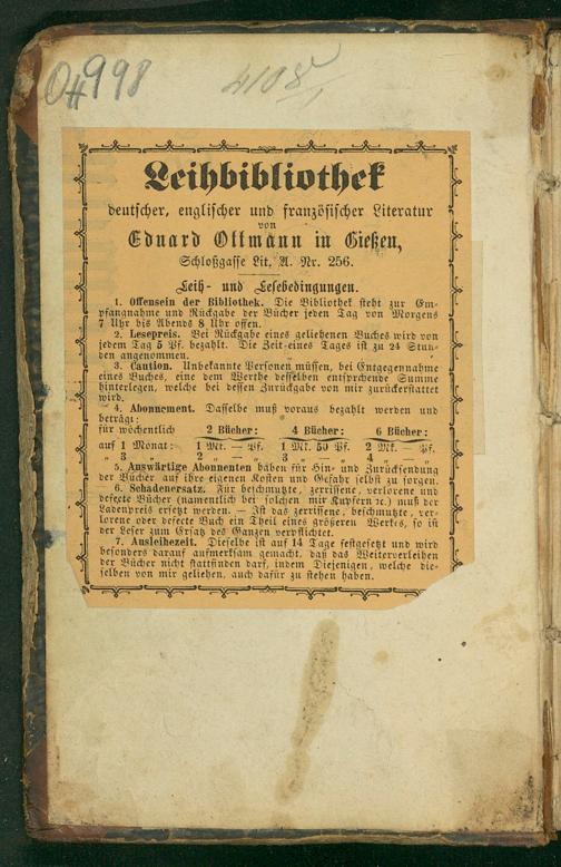 7. Ausleihezeit. Dieſelbe iſt auf 14 Tage feſtgeſetzt und wird beſonders darauf aufmerkſam gemacht, daß das Weiterverleihen der Vücher nicht ſtattfinden darf indem Diejenigen, welche die⸗ ſelben von mir geliehen, auch dafür zu ſtehen haben⸗