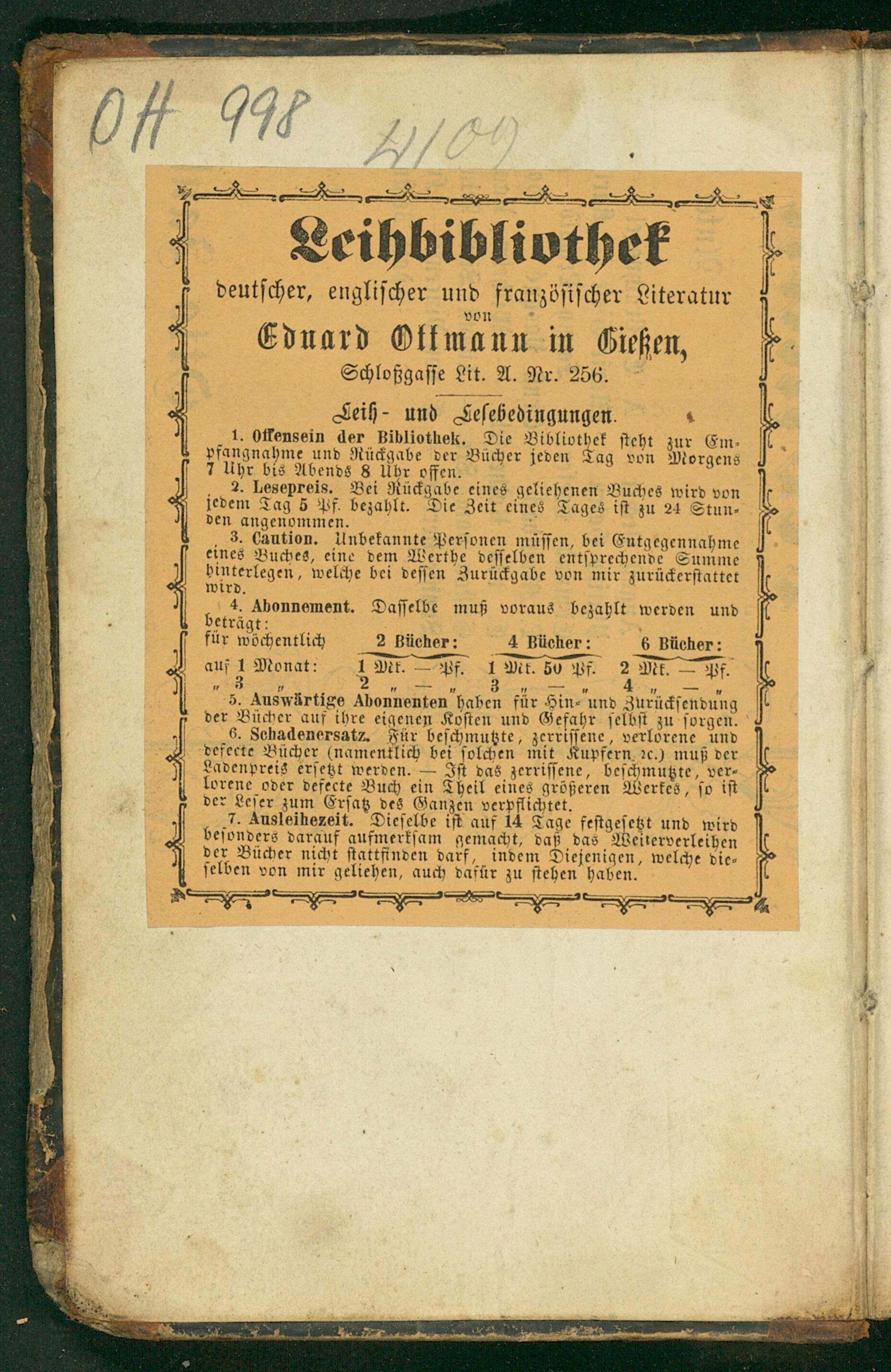 Leihbibliothetk deutſcher, engliſcher und franzöſiſcher Literatur 2 vvon S 2 Cdnard Olkmann in Gießen, Schloßgaſſe Lit. A. Nr. eiß und Teſebedingungen„ 1. Oflensein der Bibliothek. Die Bibliothek ſteht zur Em⸗