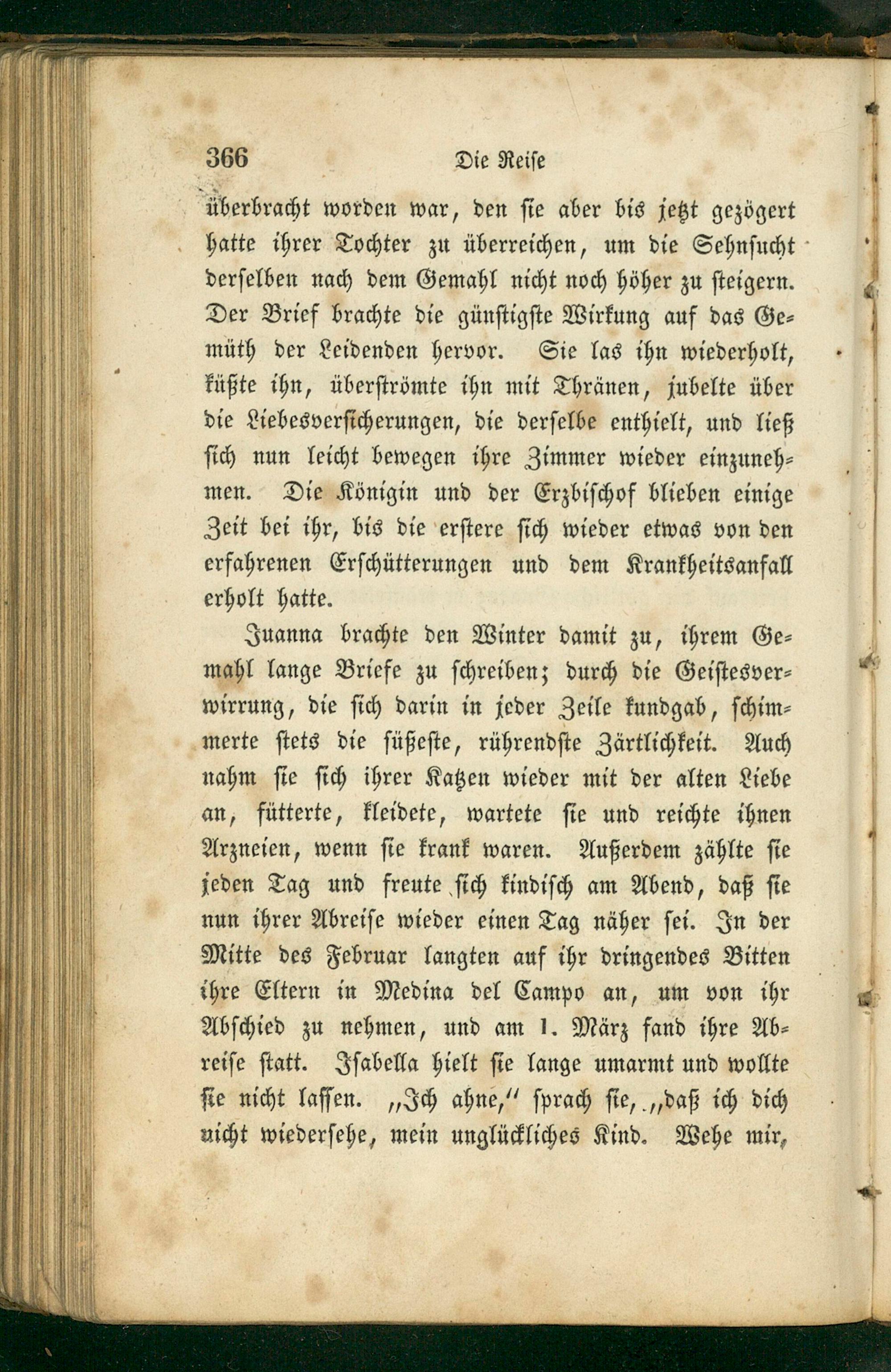 Juanna brachte den Winter damit zu, ihrem Ge⸗ mahl lange Briefe zu ſchreiben; durch die Geiſtesver⸗ wirrung, die ſich darin in jeder Zeile kundgab, ſchim⸗ merte ſtets die füßeſte, rührendſte Zärtlichkeit. Auch nahm ſie ſich ihrer Katzen wieder mit der alten Liebe an, fütterte, kleidete, wartete ſie und reichte ihnen Arzneien, wenn ſie krank waren. Außerdem zählte ſie jeden Tag und freute ſich kindiſch am Abend, daß ſie nun ihrer Abreiſe wieder einen Tag näher ſei. In der Mitte des Februar langten auf ihr dringendes Bitten ihre Eltern in Medina del Campo an, um von ihr Abſchied zu nehmen, und am 1. März fand ihre Ab⸗ reiſe ſtatt. Iſabella hielt ſie lange umarmt und wollte ſie nicht laſſen.„Ich ahne,“ ſprach ſie,„daß ich dich nicht wiederſehe, mein unglückliches Kind. Wehe mir,