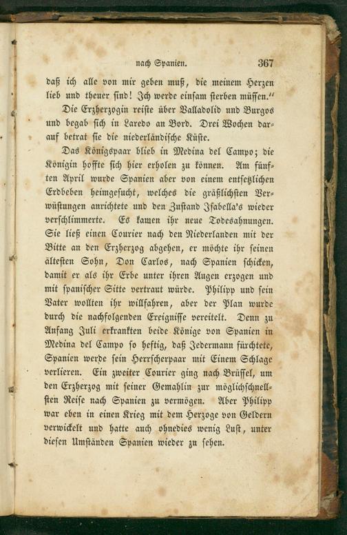 Das Königspaar blieb in Medina del Campo; die Königin hoffte ſich hier erholen zu können. Am fünf⸗ ten April wurde Spanien aber von einem entſetzlichen Erdbeben heimgeſucht, welches die gräßlichſten Ver⸗ wüſtungen anrichtete und den Zuſtand Iſabella's wieder verſchlimmerte. Es kamen ihr neue Todesahnungen. Sie ließ einen Courier nach den Niederlanden mit der Bitte an den Erzherzog abgehen, er möchte ihr ſeinen älteſten Sohn, Don Carlos, nach Spanien ſchicken, damit er als ihr Erbe unter ihren Augen erzogen und mit ſpaniſcher Sitte vertraut würde. Philipp und ſein Vater wollten ihr willfahren, aber der Plan wurde durch die nachfolgenden Ereigniſſe vereitelt. Denn zu Anfang Juli erkrankten beide Könige von Spanien in Medina del Campo ſo heftig, daß Jedermann fürchtete, Spanien werde ſein Herrſcherpaar mit Einem Schlage verlieren. Ein zweiter Courier ging nach Brüſſel, um den Erzherzog mit ſeiner Gemahlin zur möglichſchnell⸗ ſten Reiſe nach Spanien zu vermögen. Aber Philipp war eben in einen Krieg mit dem Herzoge von Geldern verwickelt und hatte auch ohnedies wenig Luſt, unter dieſen Umſtänden Spanien wieder zu ſehen.