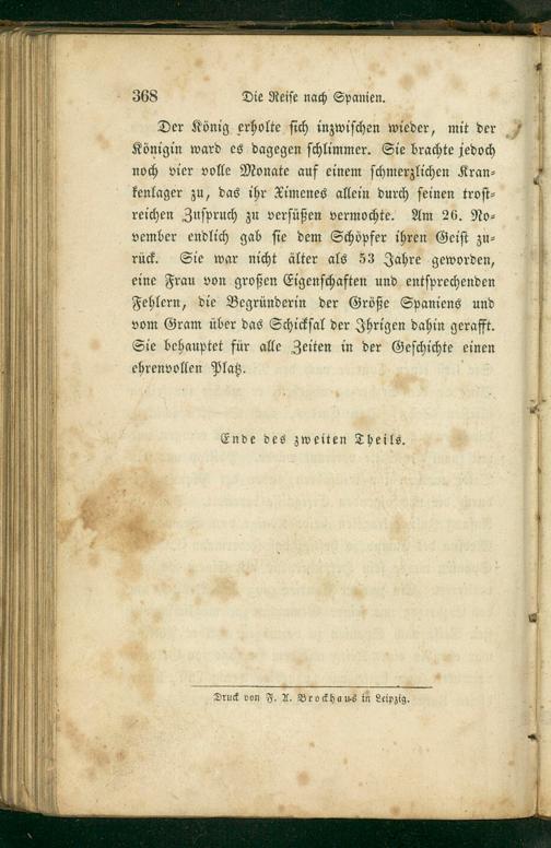 Der König erholte ſich inzwiſchen wieder, mit der Königin ward es dagegen ſchlimmer. Sie brachte jedoch noch vier volle Monate auf einem ſchmerzlichen Kran⸗ kenlager zu, das ihr Timenes allein durch ſeinen troſt⸗ reichen Zuſpruch zu verſüßen vermochte. Am 26. No⸗ vember endlich gab ſie dem Schöpfer ihren Geiſt zu⸗ rück. Sie war nicht älter als 53 Jahre geworden, eine Frau von großen Eigenſchaften und entſprechenden Fehlern, die Begründerin der Größe Spaniens und vom Gram über das Schickſal der Ihrigen dahin gerafft. Sie behauptet für alle Zeiten in der Geſchichte einen ehrenvollen Platz..