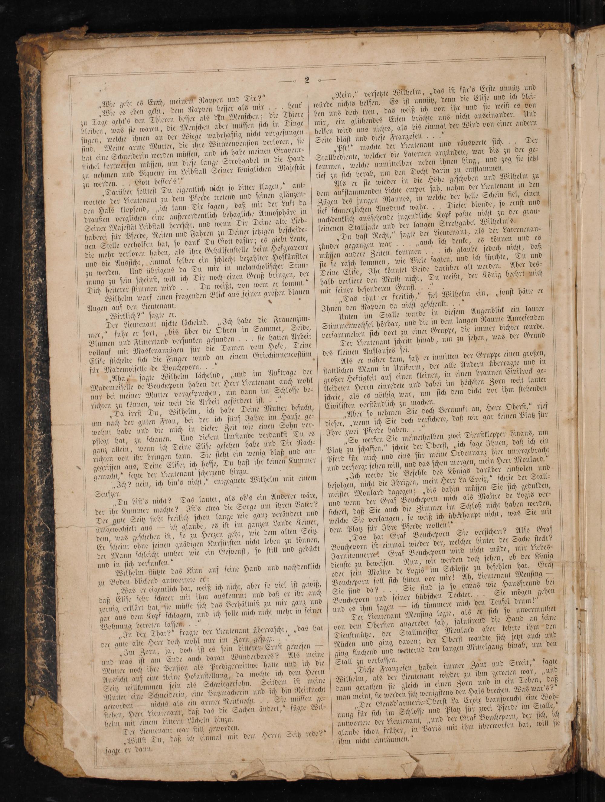 Der Lieutenant Menſing legte, als er ſich ſo unvermuthet von dem Oberſten angeredet ſah, ſalutirend die Hand an ſeine Dienſtmütze, der Stallmeiſter Moulard aber kehrte ihm den Rücken und ging davon; der Oberſt wandte ſich jetzt auch und ging fluchend und wetternd den langen Mittelgang hinab, um den Stall zu verlaſſen. 4