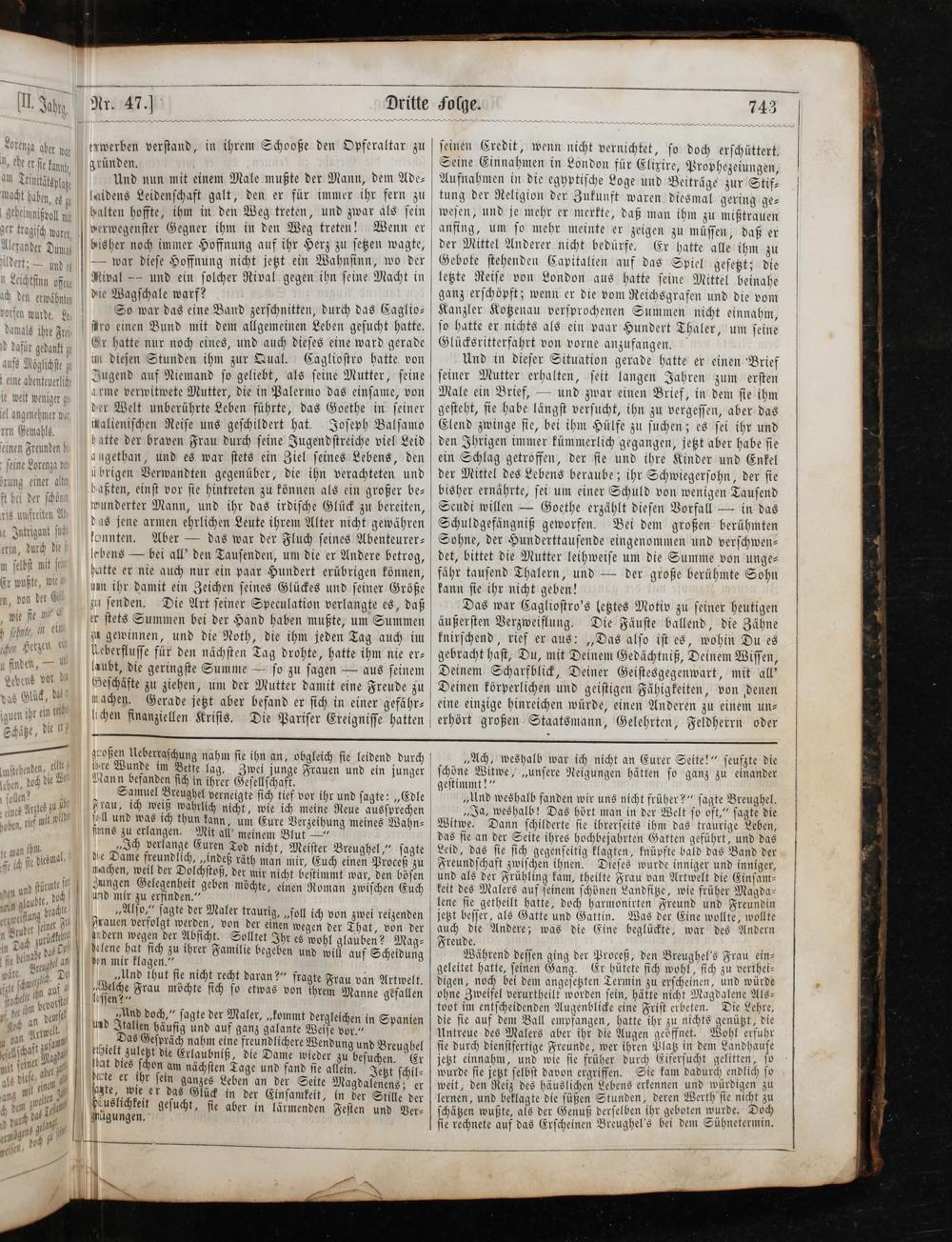 folge. 74 ſeinen Credit, wenn nicht vernichtet, ſo doch erſchüttert. Seine Einnahmen in London für Elixire, Prophezeiungen, Aufnahmen in die egyptiſche Loge und Beiträge zur Stif⸗ tung der Religion der Zukunft waren diesmal gering ge⸗ weſen, und je mehr er merkte, daß man ihm zu mißtrauen anfing, um ſo mehr meinte er zeigen zu müſſen, daß er der Mittel Anderer nicht bedürfe. Er hatte alle ihm zu Gebote ſtehenden Capitalien auf das Spiel geſetzt; die letzte Reiſe von London aus hatte ſeine Mittel beinahe ganz erſchöpft; wenn er die vom Reichsgrafen und die vom Kanzler Kotzenau verſprochenen Summen nicht einnahm, ſo hatte er nichts als ein paar Hundert Thaler, um ſeine Glücksritterfahrt von vorne anzufangen.“