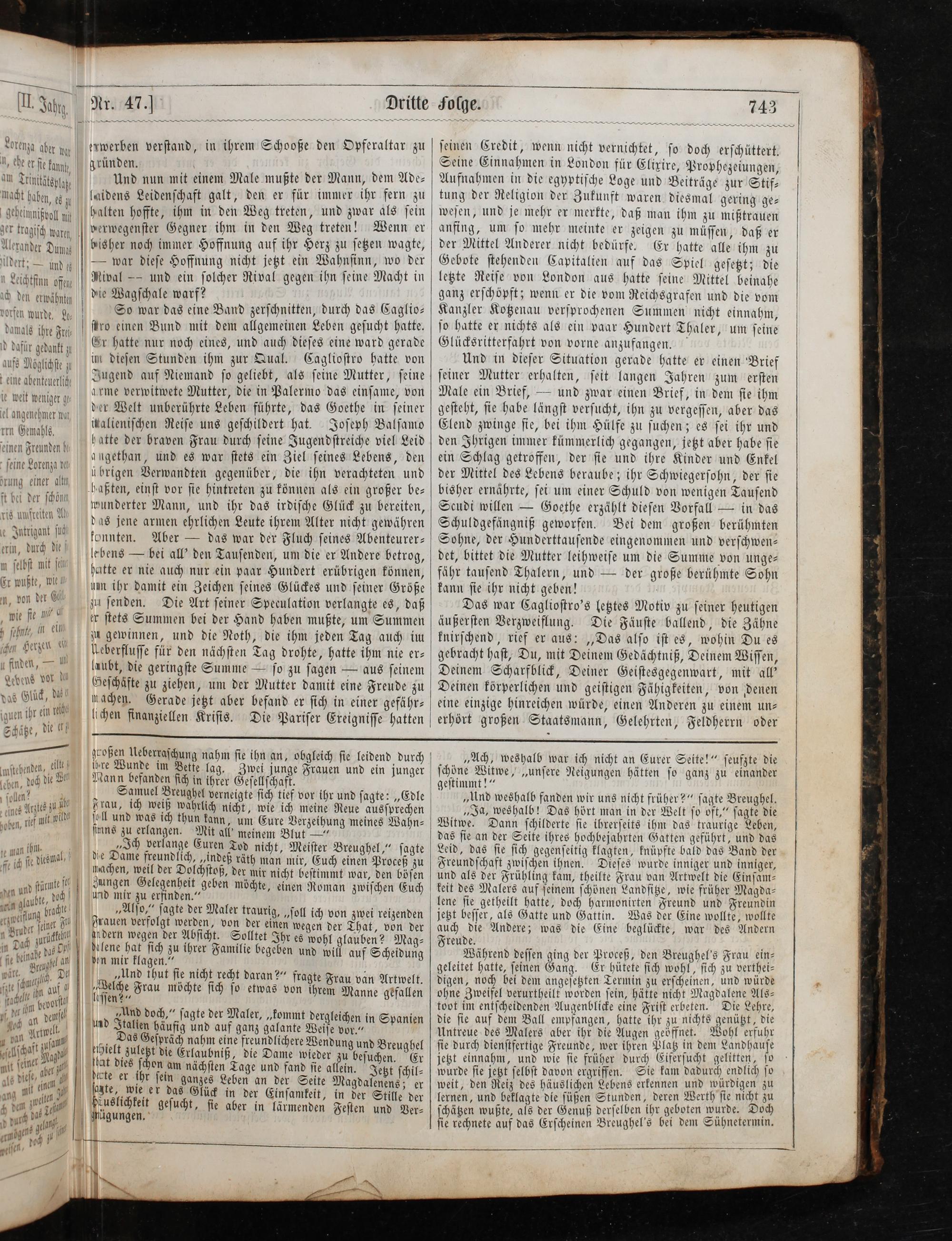 So war das eine Band zerſchnitten, durch das Caglio⸗ ſtro einen Bund mit dem allgemeinen Leben geſucht hatte. Er hatte nur noch eines, und auch dieſes eine ward gerade im dieſen Stunden ihm zur Qual. Caglioſtro hatte von Zugend auf Niemand ſo geliebt, als ſeine Mutter, ſeine arme verwitwete Mutter, die in Palermo das einſame, von der Welt unberührte Leben führte, das Goethe in ſeiner italieniſchen Reiſe uns geſchildert hat. Joſeph Balſamo hatte der braven Frau durch ſeine Jugendſtreiche viel Leid angethan, und es war ſtets ein Ziel ſeines Lebens, den übrigen Verwandten gegenüber, die ihn verachteten und haßten, einſt vor ſie hintreten zu können als ein großer be⸗ wunderter Mann, und ihr das irdiſche Glück zu bereiten, das jene armen ehrlichen Leute ihrem Alter nicht gewähren konnten. Aber— das war der Fluch ſeines Abenteurer⸗ lebens— bei all' den Tauſenden, um die er Andere betrog, hatte er nie auch nur ein paar Hundert erübrigen können, unn ihr damit ein Zeichen ſeines Glückes und ſeiner Größe zu ſenden. Die Art ſeiner Speeulation verlangte es, daß er ſtets Summen bei der Hand haben mußte, um Summen zu gewinnen, und die Noth, die ihm jeden Tag auch iut Uleberfluſſe für den nächſten Tag drohte, hatte ihm nie er⸗ laubt, die geringſte Summe— ſo zu ſagen— aus ſeinem Geſchäfte zu ziehen, um der Mutter damit eine Freude zu machen. Gerade jetzt aber befand er ſich in einer gefähr⸗ lichen finanziellen Kriſis. Die Pariſer Ereigniſſe hatten