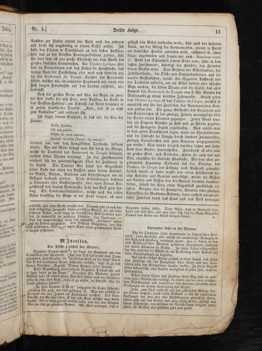 Nachbar zur Linken nimmt eine Priſe nach der anderen und dreht ſich ungeduldig in ſeinem Seſſel umher. Ich habe den Oberon in Deutſchland an den beſten Hofthea⸗ tern und an den kleinſten Provinzialbühnen geſehen, hier wie dort fand ich eine große Ehrfurcht vor dem Werke des großen deutſchen Componiſten. Am Théätre Lyrique aber ſind die Decorationen und das Ballet die Hauptſache, das wenige Gute der Darſtellung aber wird noch förmlich un⸗ ter den Boulevard du Temple-Späßen des Haremauf⸗ ſehers, welcher wie ein completer Hanswurſt mit einem vier Fuß langen Federbuſche auf dem Turban erſcheint, un— terdrückt.