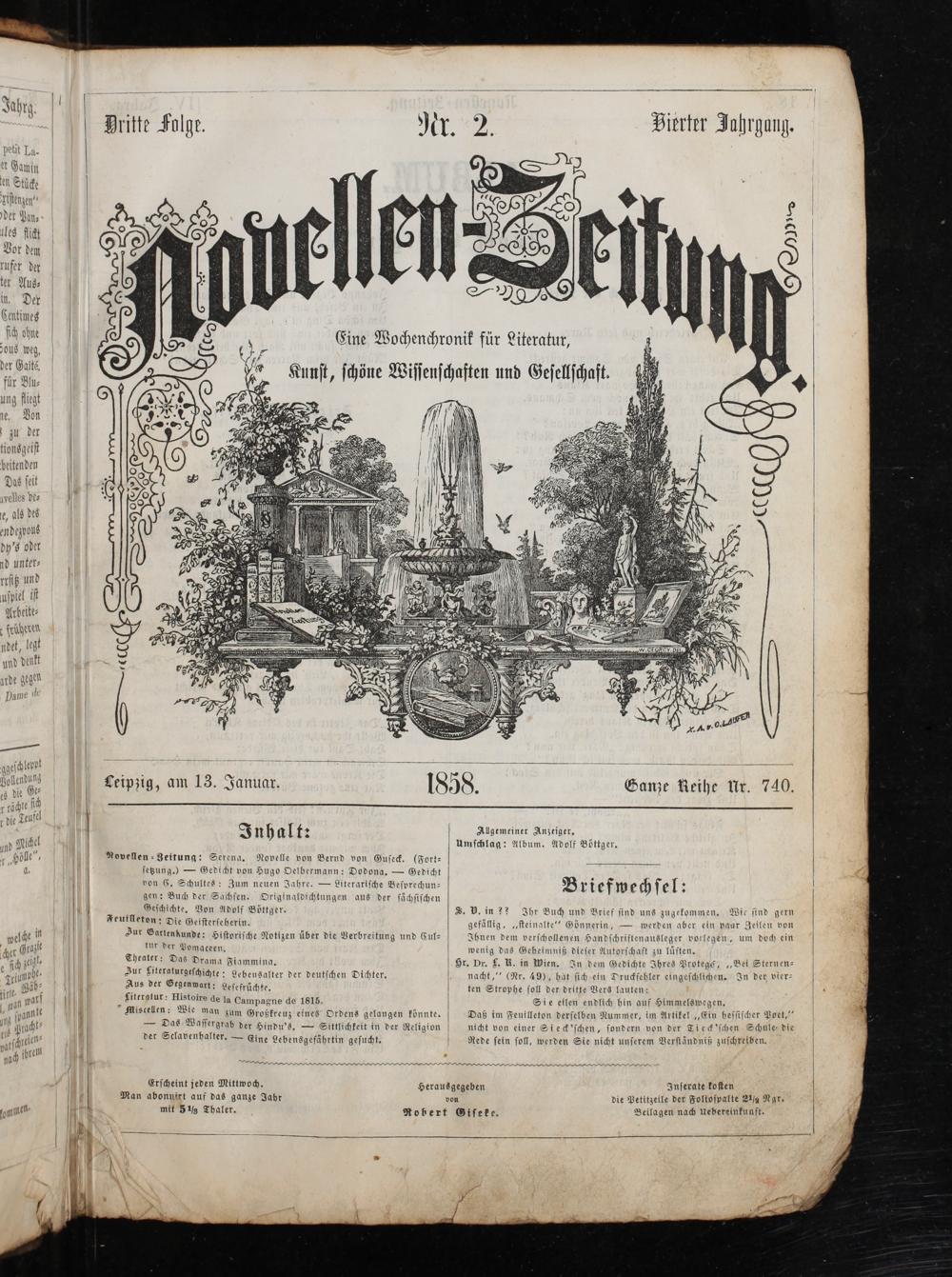 Novellen⸗Zeitung: Serena. Novelle von Bernd von Guſeck.(Fort⸗ ſetzung.)— Gedicht von Hugo Oelbermann: Dodona.— Gedicht von C. Schultes: Zum neuen Jahre.— Literariſche Beſprechun⸗ gen: Buch der Sachſen. Originaldichtungen aus der ſächſiſchen