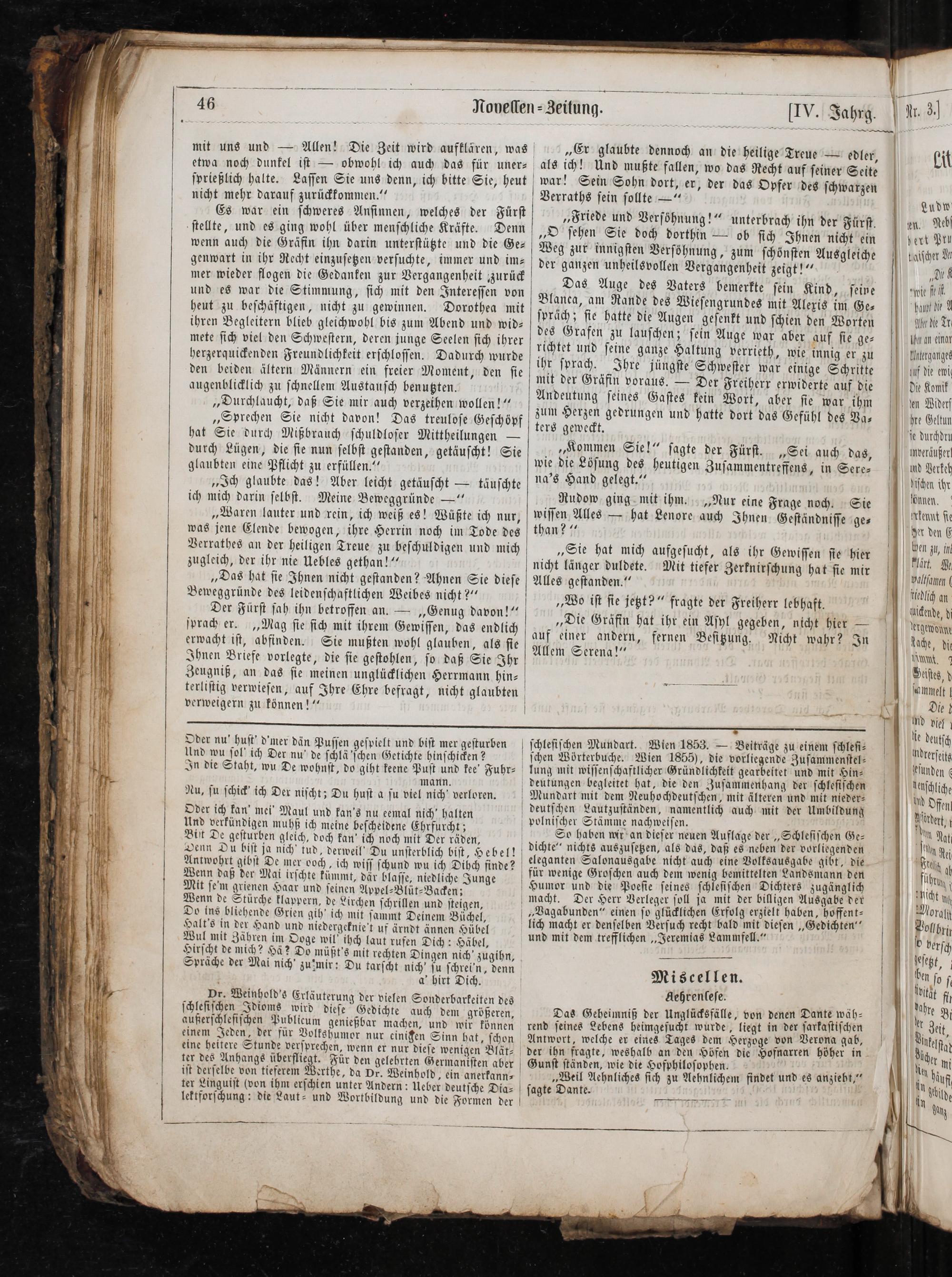 Oder ich kan mei' Maul und kan's nu eemal nich' halten Und verkündigen muhß ich meine beſcheidene Ehrfurcht; Biſt De geſturben gleich, doch kan“ ich noch mit Der räden, Denn Du biſt ja nich' tud, derweil Du unſterblich biſt, Hebel! Antwohrt gibſt De mer ooch, ich wiſſ ſchund wu ich Dihch finde? Wenn daß der Mai irſchte kümmt, där blaſſe, niedliche Junge Mit ſe'm grienen Haar und ſeinen Appel⸗Blüt⸗Backen; 3 Wenn de Stürche klappern, de Lirchen ſchrillen und ſteigen, Do ins bliehende Grien gih' ich mit ſammt Deinem Büchel, Halt's in der Hand und niedergeknie't uf ärndt ännen Hübel Wul mit Zähren im Ooge wil ihch laut rufen Dich: Häbel, Hirſcht de mich? Hä? Do müßt's mit rechten Dingen nich zugihn, Spräche der Mai nich' zumir: Du tarſcht nich' ſu ſchrei'n, denn a' hirt Dich. Dr. Weinhold's Erläuterung der vielen Sonderbarkeiten des ſchleſiſchen Idioms wird dieſe Gedichte auch dem größeren, außerſchleſiſchen Publicum genießbar machen, und wir können einem Jeden, der für Volkshumor nur einigen Sinn hat, ſchon eine heitere Stunde verſprechen, wenn er nur dieſe wenigen Blät⸗ ter des Anhangs überfliegt. Für den gelehrten Germaniſten aber Gunſt ſtänden, wie die Hofphiloſophen. iſt derſelbe von tieferem Werthe, da Dr. Weinhold, ein anerkann⸗„Weil Aehnliches ſich zu Aehnlichem findet und es anzieht,“ ter Linguiſt(von ihm erſchien unter Andern: Ueber deutſche Dia⸗ ſagte Dante. lektforſchung: die Laut⸗ und Wortbildung und die Formen der