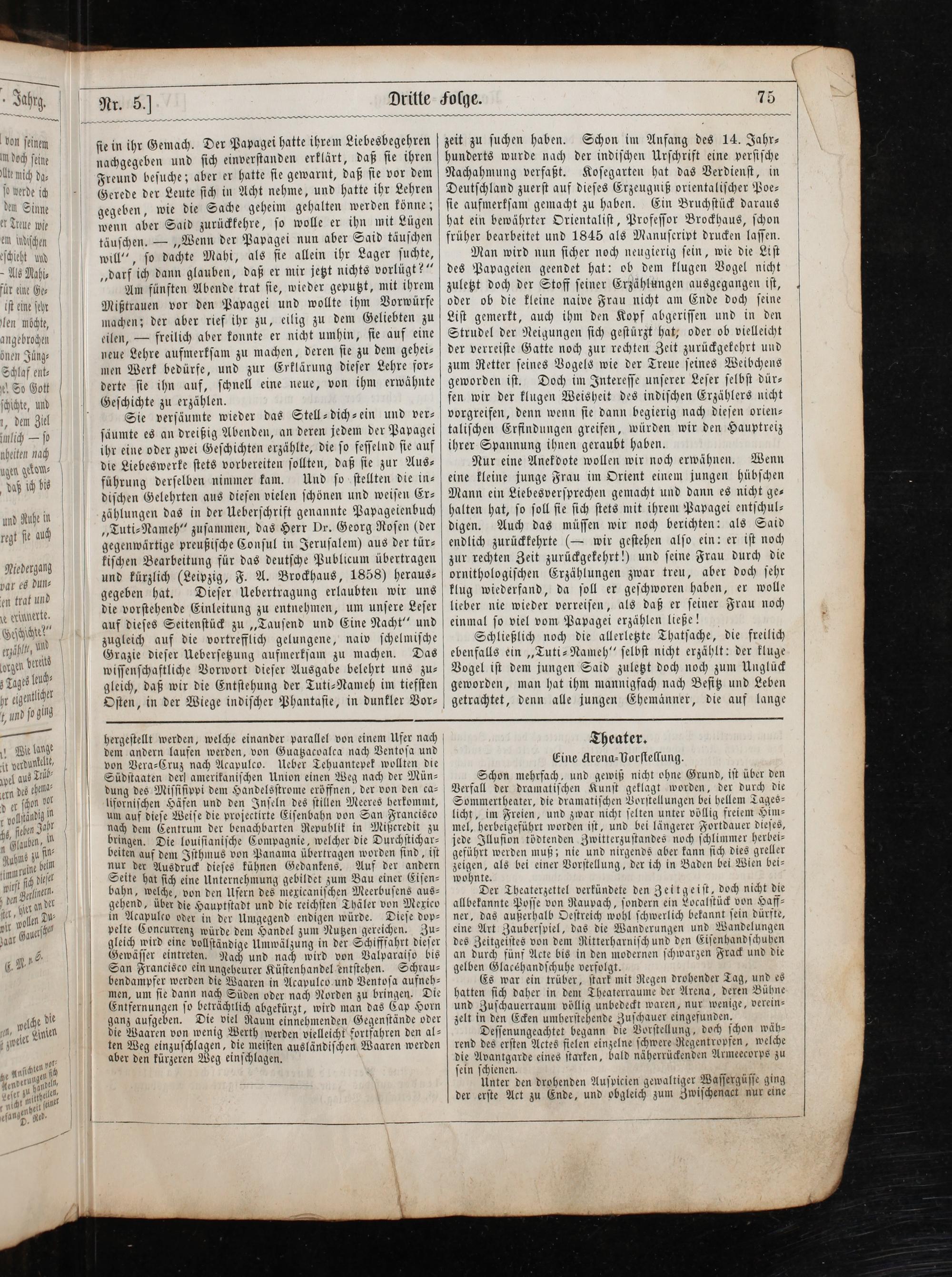 Sie verſäumte wieder das Stell-dich-ein und ver⸗ ſäumte es an dreißig Abenden, an deren jedem der Papagei ihr eine oder zwei Geſchichten erzählte, die ſo feſſelnd ſie auf die Liebeswerke ſtets vorbereiten ſollten, daß ſie zur Aus⸗ führung derſelben nimmer kam. Und ſo ſtellten die in⸗ diſchen Gelehrten aus dieſen vielen ſchönen und weiſen Er⸗ zählungen das in der Ueberſchrift genannte Papageienbuch „Tuti⸗Nameh“ zuſammen, das Herr Dr. Georg Roſen(der gegenwärtige preußiſche Conſul in Jeruſalem) aus der tür⸗ kiſchen Bearbeitung für das deutſche Publicum übertragen und kürzlich(Leipzig, F. A. Brockhaus, 1858) heraus⸗ gegeben hat. Dieſer Uebertragung erlaubten wir uns die vorſtehende Einleitung zu entnehmen, um unſere Leſer auf dieſes Seitenſtück zu„Tauſend und Eine Nacht“ und