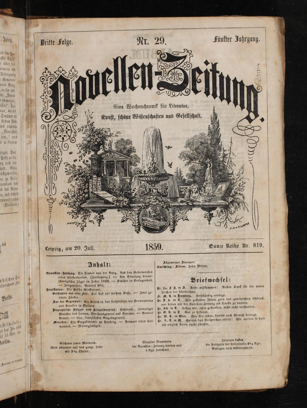 — 4=— inazi Anſ;. Leipzig, am 20. Juli. Ganze Reihe Ur. 819. Inh alt: Algemeiner Anzeiger. umſchlag: Album. John Milton. Novellen⸗Zeitung: Die Damen von der Burg. Aus den Geheimniſſen— phiſ chen De⸗ nmdürte z ue(Fortſetzung.)— Ein Streifzug braun⸗ 4 2 honde el⸗ weigiſcher Jäger im Jahre 1809.— Schiller in Verl heit j 7 wrechende?. 9.) erlegenheit.. eſpre— Zeitgenoſſen. General Niel. B ri efw ech ſe. Feuilleton: Die Gräfin Giuſtinigni. Hr. Dr. S. H. in A. Sehr willkommen! Beſten Dank für die neuen 9 rlin. Geſchichten aus alter Zeit; Der Tod auf weißem Roſſe.— Zwei ge⸗ Zeichen der Theilnahme. B 4 lehrte Zänker. Fr. K. V. in Dromberg. Vollſtändig erledigt. Zus der Gegenwart: Ein Beſuch in den Hoſpitälern der Verwundeten Hr. D. S. in C. Wir geſtatten Ihnen gern den gewünſchten Abdruck, 4 und Kranken in Mailand. nur bitten wir die Novellen-Zeitung als Quelle zu nennen. X Biographiſche Aihden vam Kriegsſchauplatz: Espinaſſe, ehemaliger Hr. Sch. in C. Habhen wir, offen geſtanden, nicht recht verſtanden. M 1 Miniſter des Innern, Diviſionsgeneral und Senator.— General Hr. G. R. in D. Gar zu bekaunnt. katl⸗ Beuret.— Cler, franzöſiſcher Brigadegeneral.(Hr. W. T. in Wien. Wie Sie ſehen, bereits nach Wunſch beſorgt. riſt iſch⸗ſe 4 4. b Miscellen: Die Bergakademie zu Freiberg.— Antwort eines Hof⸗ Hr. A. T. in K. Endlich das Verſprechen erfüllt! Wir werden ſo bald „de In⸗ und 9 mannes.— Mannigfaltiges. als möglich Raum dafür ſchaffen. ⸗ Wrn. al 1 1 Nri.———y——— 212151 2