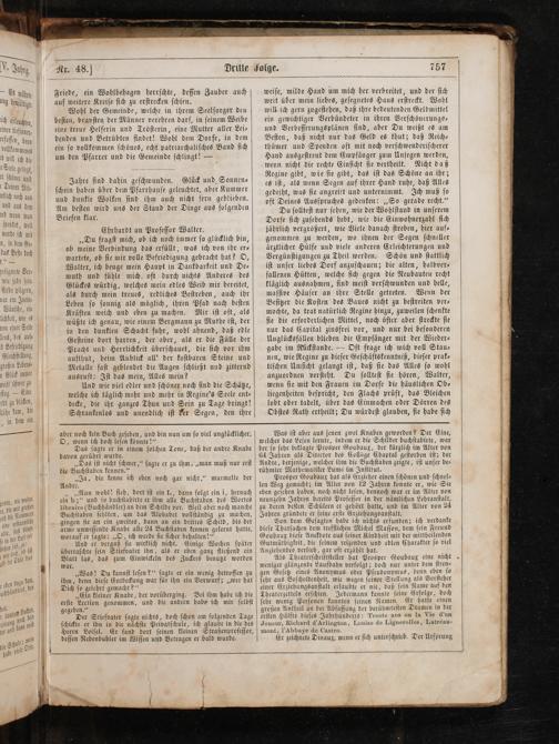 „Nun wohll ſieh, dort iſt ein L, dann folgt ein i, hernach ein b;“ und ſo buchſtabirte er ihm alle Buchſtaben des Wortes libraire(Buchhändler) an dem Schilde vor. Weil aber noch manche Buchſtaben fehlten, um das Alphabet vollſtändig zu machen, gingen ſie an ein zweites, dann an ein drittes Schild, bis der arme unwiſſende Knabe alle 24 Buchſtaben kennen gelernt hatte, worauf er ſagte:„O, ich werde ſie ſicher behalten!“