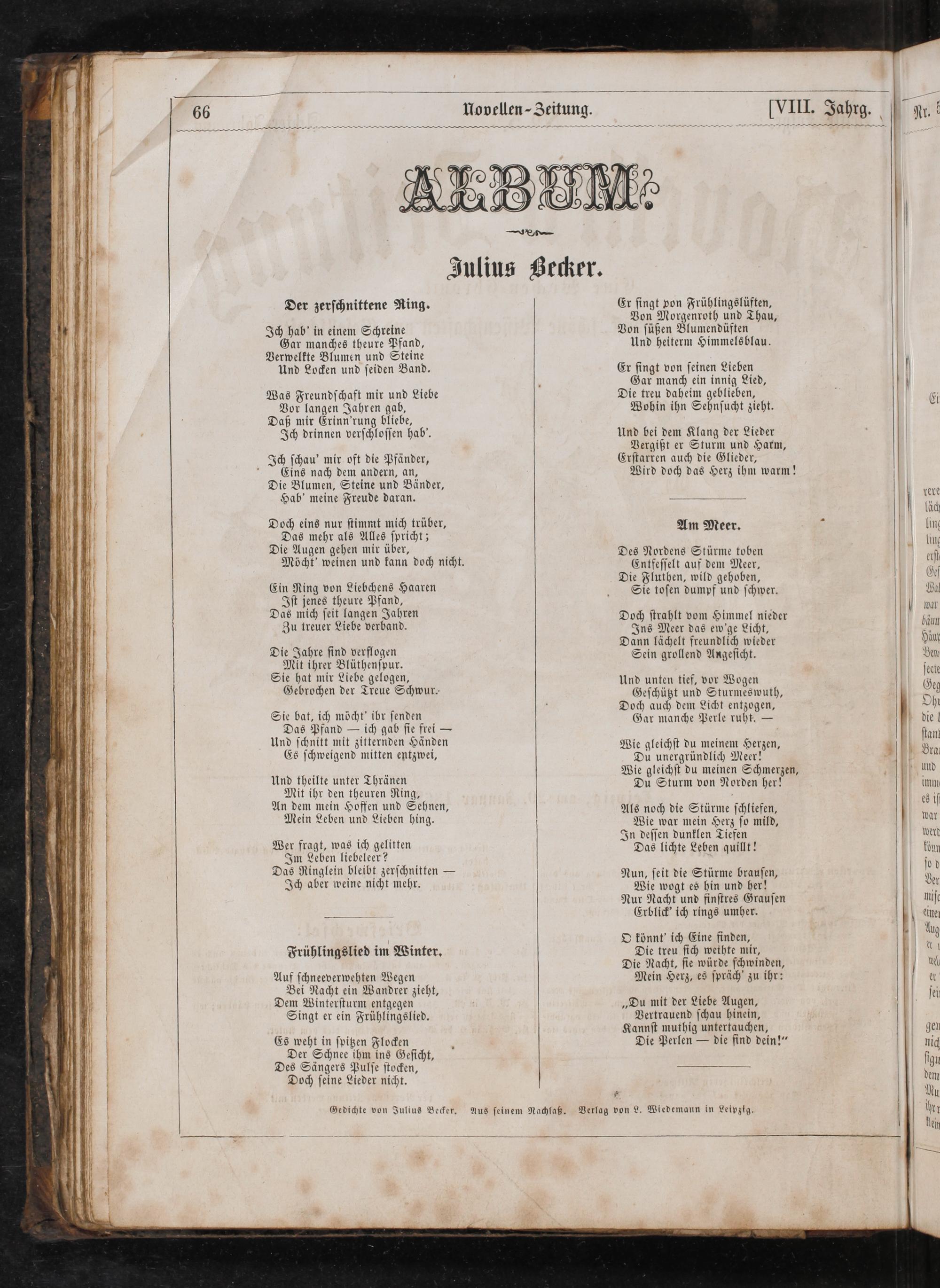 Es weht in ſpitzen Flocken Der Schnee ihm ins Geſicht, Des Sängers Pulſe ſtocken, Doch ſeine Lieder nicht.