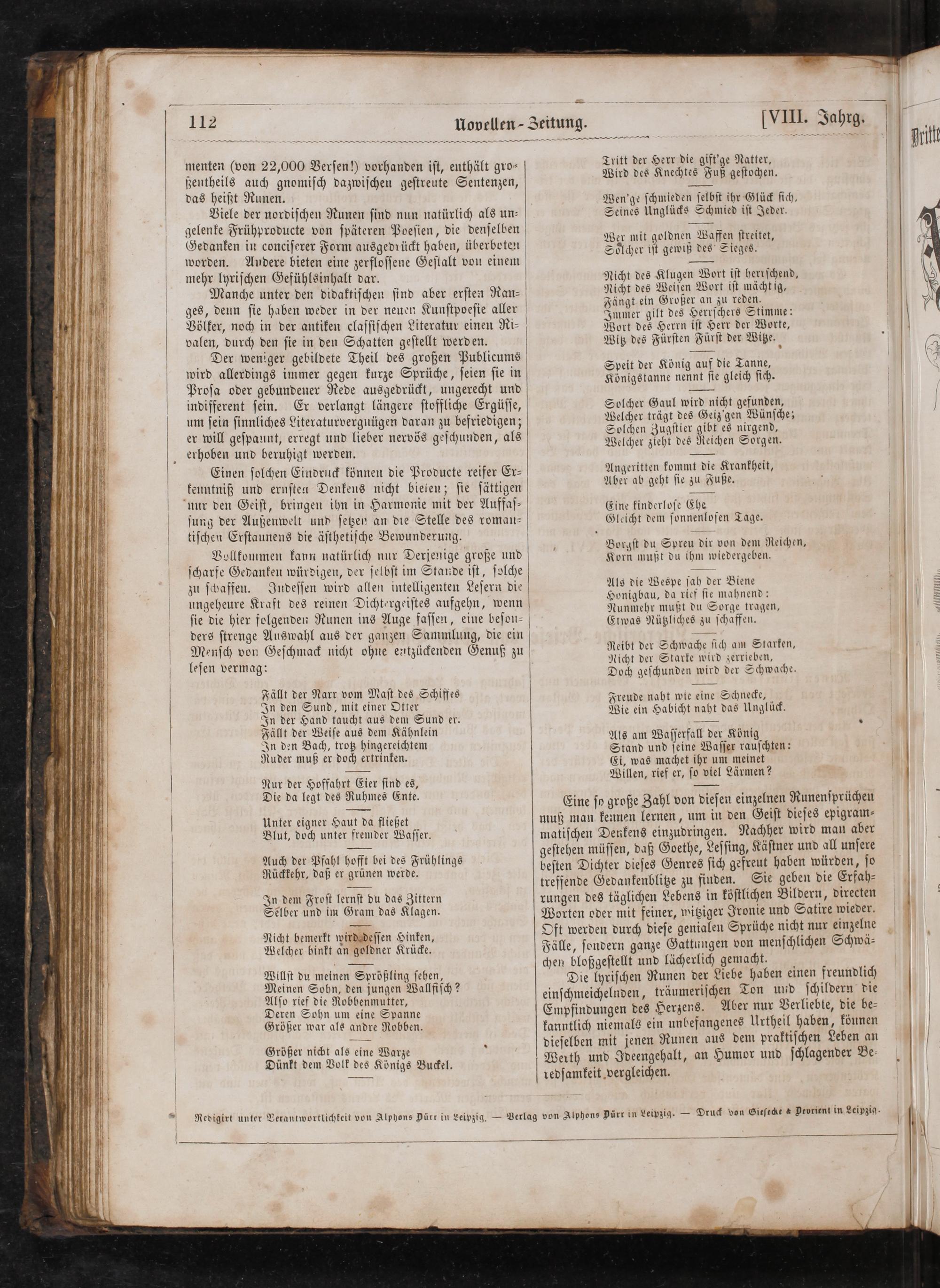 Vollkommen kann natürlich nur Derjenige große und V ſcharfe Gedanken würdigen, der ſelbſt im Stande iſt, ſolche V zu ſchaffen. Indeſſen wird allen intelligenten Leſern die ungeheure Kraft des reinen Dichtergeiſtes aufgehn, wenn ſie die hier folgenden Runen ins Auge faſſen, eine beſon⸗ ders ſtrenge Auswahl aus der ganzen Sammlung, die ein Menſch von Geſchmack nicht ohne entzückenden Genuß zu leſen vermag: