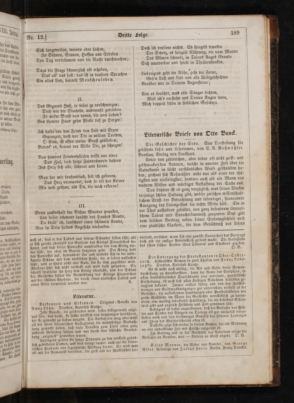 Silas Marner, der Weber von Raveloe, von George Eliot. Ueberſetzt von Julius Freſe. Berlin, Franz Duncker.