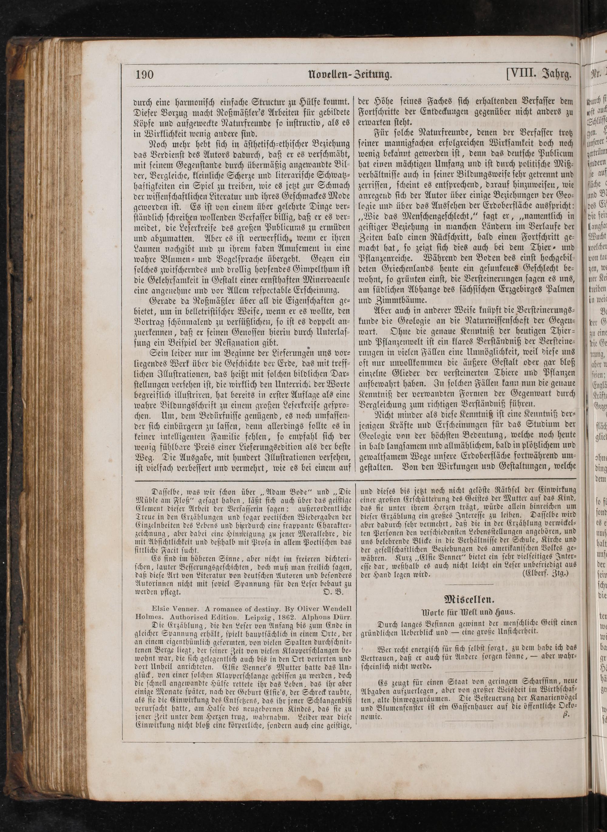 Elsie Venner. A romance of destiny. By Oliver Wendell. Holmes. Authorised Edition. Leipzig, 1862. Alphons Dürr. Die Erzählung, die den Leſer von Anfang bis zum Ende in gleicher Spannung erhält, ſpielt hauptſächlich in einem Orte, der an einem eigenthümlich geformten, von vielen Spalten durchſchnit⸗ tenen Berge liegt, der ſeiner Zeit von vielen Klapperſchlangen be⸗ wohnt war, die ſich gelegentlich auch bis in den Ort verirrten und dort Unheil anrichteten. Elſie Venner's Mutter hatte das Un⸗ glück, von einer ſolchen Klapperſchlange gebiſſen zu werden, doch die ſchnell angewandte Hülfe rettete ihr das Leben, das ihr aber einige Monate ſpäter, nach der Geburt Elſie's, der Schreck raubte, als ſie die Einwirkung des Entſetzens, das ihr jener Schlangenbiß verurſacht hatte, am Halſe des neugebornen Kindes, das ſie zu jener Zeit unter dem Herzen trug, wahrnahm. Leider war dieſe Einwirkung nicht bloß eine körperliche, ſondern auch eine geiſtige,
