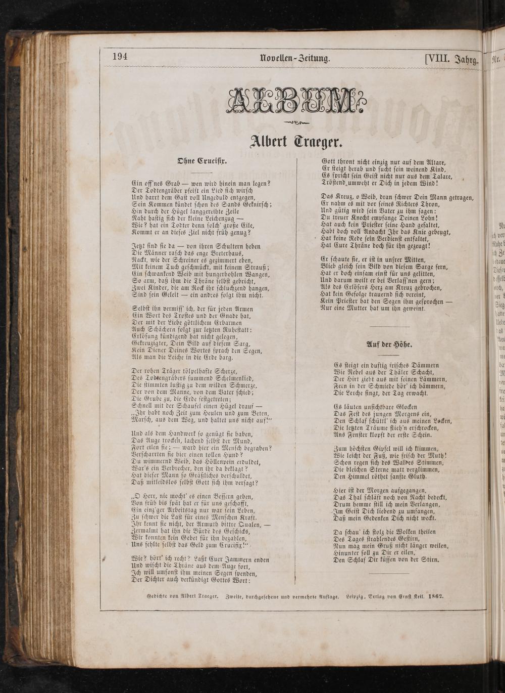 .——— 194 Uovellen-Zeitung.[VIII. Jahrg. Ar. (O 0 d 6 ₰ᷣN— ’ 4 8 Albert Traeger Ohne Crueifix. Gott thront nicht einzig nur auf dem Altare, Er ſteigt herab und ſucht ſein weinend Kind, 4 Es ſpricht ſein Geiſt nicht nur aus dem Talare, Ein offnes Grab— wen wird hinein man legen? Tröſtend umweht er Dich in jedem Wind! Der Todtengräber pfeift ein Lied ſich wirſch——. Und harrt dan Gaſt voll Ungeduld entgegen, Das Kreuz, o Weib, dran ſchwer Dein Mann getragen, Sein Kommen kündet ſchon des Sands Geknirſch; Er nahm es mit vor ſeines Richters Thron, Hin durch der Hügel langgereihte Zeile Und gütig wird ſein Vater zu ihm ſagen:' Naht haſtig ſich der kleine Leichenzug— Du treuer Knecht empfange Deinen Lohn! Wie? hat ein Todter denn ſolch' große Eile, Hat auch kein Prieſter ſeine Hand gefaltet, RN Kommt er an dieſes Ziel nicht früh genug? Habt doch voll Andacht Ihr das Knie gebeugt, ih ver Hat keine Rede ſein Verdienſt entfaltet, Fabel Jetzt ſind ſie da— von ihren Schultern heben Hat Eure Thräne doch für ihn gezeugt! Rahe Die Männer raſch das enge Breterhaus,—. it Ze Nackt, wie der Schreiner es gezimmert eben, Er ſchaute ſie, er iſt in unſrer Mitten, ſedaue Mit keinem Tuch geſchmückt, mit keinem Strauß; Blieb gleich ſein Bild von dieſem Sarge fern, Dieſen Ein ſchwankend Weib mit hungerhohlen Wangen, Hat er doch einſam einſt für uns gelitten, deſell So arm, daß ihm die Thräne ſelbſt gebricht, Und darum weilt er bei Verlaſſ'nen gern; deſe Zwei Kinder, die am Rock ihr ſchluchzend hangen, Als des Erlöſers Herz am Kreuz gebrochen, ſoch, Sind ſein Geleit— ein andres folgt ihm nicht. Hat kein Gefolge trauernd ſich vereint, ler W Kein Prieſter hat den Segen ihm geſprochen— Sieg Selbſt ihn vermiſſ' ich, der für jeden Armen Nur eine Mutter hat um ihn geweint. ſ Ein Wort des Troſtes und der Gnade hat, ja 6 Der mit der Liebe göttlichem Erbarmen Nebe Auch Schächern folgt zur letzten Ruheſtatt: das Erlöſung kündigend hat nicht gelegen, A- Gekreuzigter, Dein Bild auf dieſem Sarg, Auf der Höhe. wc Kein Diener Deines Wortes ſprach den Segen, a Als man die Leiche in die Erde barg. NM Es ſteigt ein duftig friſches Dämmern ba⸗ Der rohen Träger tölpelhafte Scherze, Wie Nebel aus der Thäler Schacht, M Des Todtengräbers ſummend Schelmenlied, Der Hirt ziebt aus mit ſeinen Lämmern, ar Die ſtimmten luſtig zu dem wilden Schmerze, Fern in der Schmiede hör' ich hämmern, c Der von dem Manne, von dem Vater ſchied; Die Lerche ſingt, der Tag erwacht. fro Die Grube zu, die Erde feſtgetreten; cei Schnell mit der Schaufel einen Hügel drauf— Es läuten unſichtbare Glocken ha „Ihr habt noch Zeit zum Heulen und zum Beten, Das Feſt des jungen Morgens ein, wi Marſch, aus dem Weg, und haltet uns nicht auf!“ Den Schlaf ſchüttl' ich aus meinen Locken, 3 Die letzten Träume flieh'n erſchrocken, fa Und als dem Handwerk ſo genügt ſie haben, Ans Fenſter klopft der erſte Schein. un Das Auge trocken, lachend ſelbſt der Mund, e Fort eilen ſie;— ward hier ein Menſch begraben? Zum höchſten Gipfel will ich klimmen, a Verſcharrten ſie hier einen tollen Hund? Wie leicht der Fuß, wie friſch der Muth! Du wimmernd Weib, das Höllenpein erduldet, Schon regen ſich des Waldes Stimmen, n Wars ein Verbrecher, den ihr da beklagt? Die bleichen Sterne matt verglimmen, I Hat dieſer Mann ſo Gräßliches verſchuldet, Den Himmel röthet ſanfte Gluth. 1 h Daß mitleidslos ſelbſt Gott ſich ihm verſagt? A Hier iſt der Morgen aufgegangen, a „O Herr, nie mocht' es einen Beſſern geben, Das Thal ſchläft noch von Nacht bedeckt, Von früh bis ſpät hat er für uns geſchafft, Drum hemme ſtill ich mein Verlangen, Ein einz'ger Arbeitstag nur war ſein Leben, Im Geiſt Dich liebend zu umfangen, Zu ſchwer die Laſt für eines Menſchen Kraft. Daß mein Gedenken Dich nicht weckt. Ihr kennt ſie nicht, der Armuth bittre Qualen,— Zermalmt hat ihn die Bürde des Geſchicks, Da ſchau' ich ſtolz die Wolken theilen Wir konnten kein Gebet für ihn bezahlen, Des Tages ſtrahlendes Geſtirn, Uns fehlte ſelbſt das Geld zum Crucifix!“ Nun mag mein Gruß nicht länger weilen, Hinunter ſoll zu Dir er eilen, Wie? hört' ich recht? Laßt Euer Jammern enden Den Schlaf Dir küſſen von der Stirn. Und wiſcht die Thräne aus dem Auge fort, Ich will umſonſt ihm meinen Segen ſpenden,—— Der Dichter auch verkündigt Gottes Wort: Gedichte von Albert Traeger. Zweite, durchgeſehene und vermehrte Auflage. Leipzig, Verlag von Ernſt Keil. 1862.
