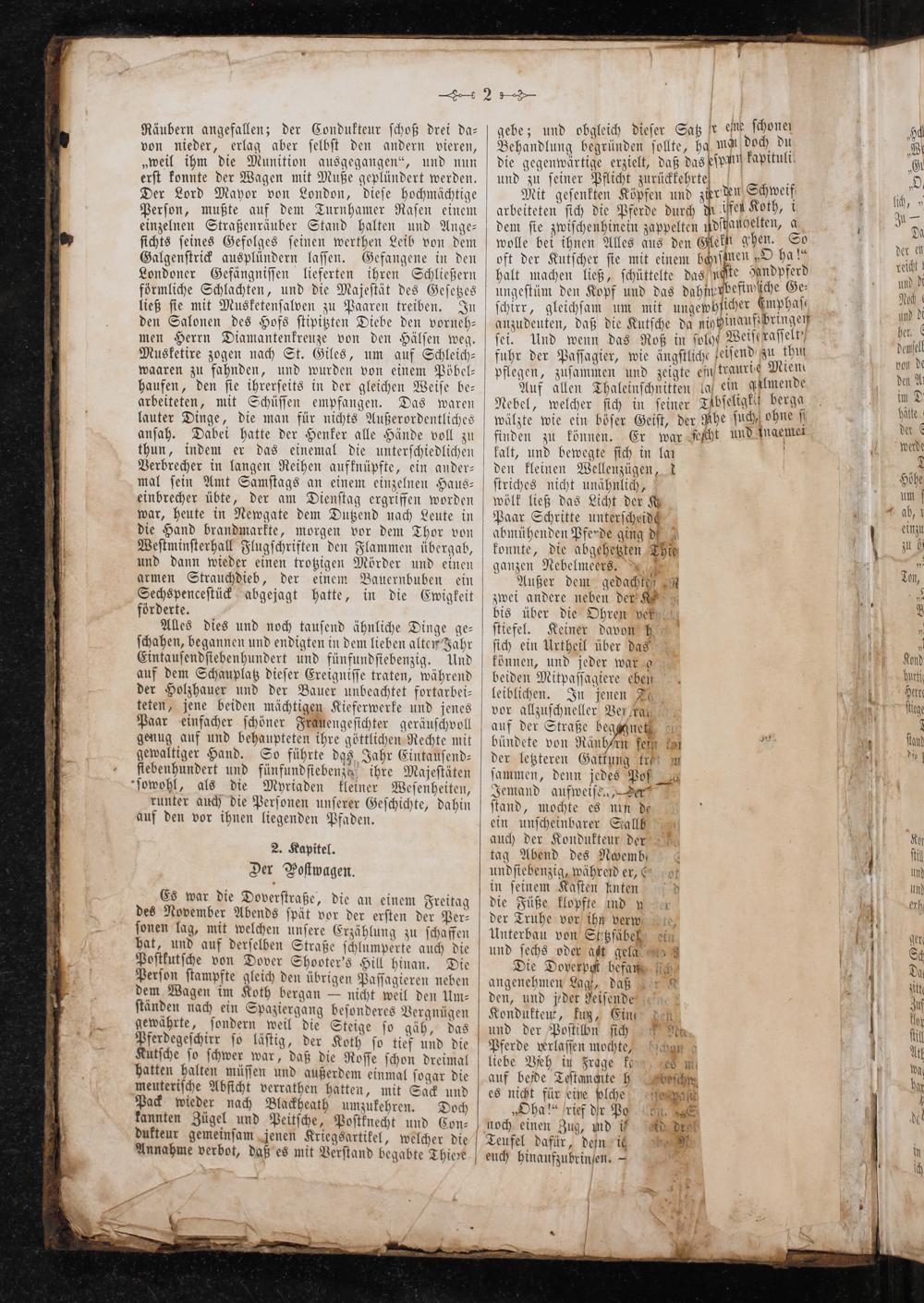 Es war die Doverſtraße, die an einem Freitag des November Abends ſpät vor der erſten der Per⸗ ſonen lag, mit welchen unſere Erzählung zu ſchaffen hat, und auf derſelben Straße ſchlumperte auch die Poſtkutſche von Dover Shooter's Hill hinan. Die Perſon ſtampfte gleich den übrigen Paſſagieren neben dem Wagen im Koth bergan— nicht weil den Um⸗ ſtänden nach ein Spaziergang beſonderes Vergnügen gewährte, ſondern weil die Steige ſo gäh, das Pferdegeſchirr ſo läſtig, der Koth ſo tief und die Kutſche ſo ſchwer war, daß die Roſſe ſchon dreimal hatten halten müſſen und außerdem einmal ſogar die meuteriſche Abſicht verrathen hatten, mit Sack und Pack wieder nach Blackheath umzukehren. Doch kannten Zügel und Peitſche, Poſtknecht und Con⸗ dukteur gemeinſam jenen Kriegsartikel, welcher die Annahme verbot, daß es mit Verſtand begabte Thiere