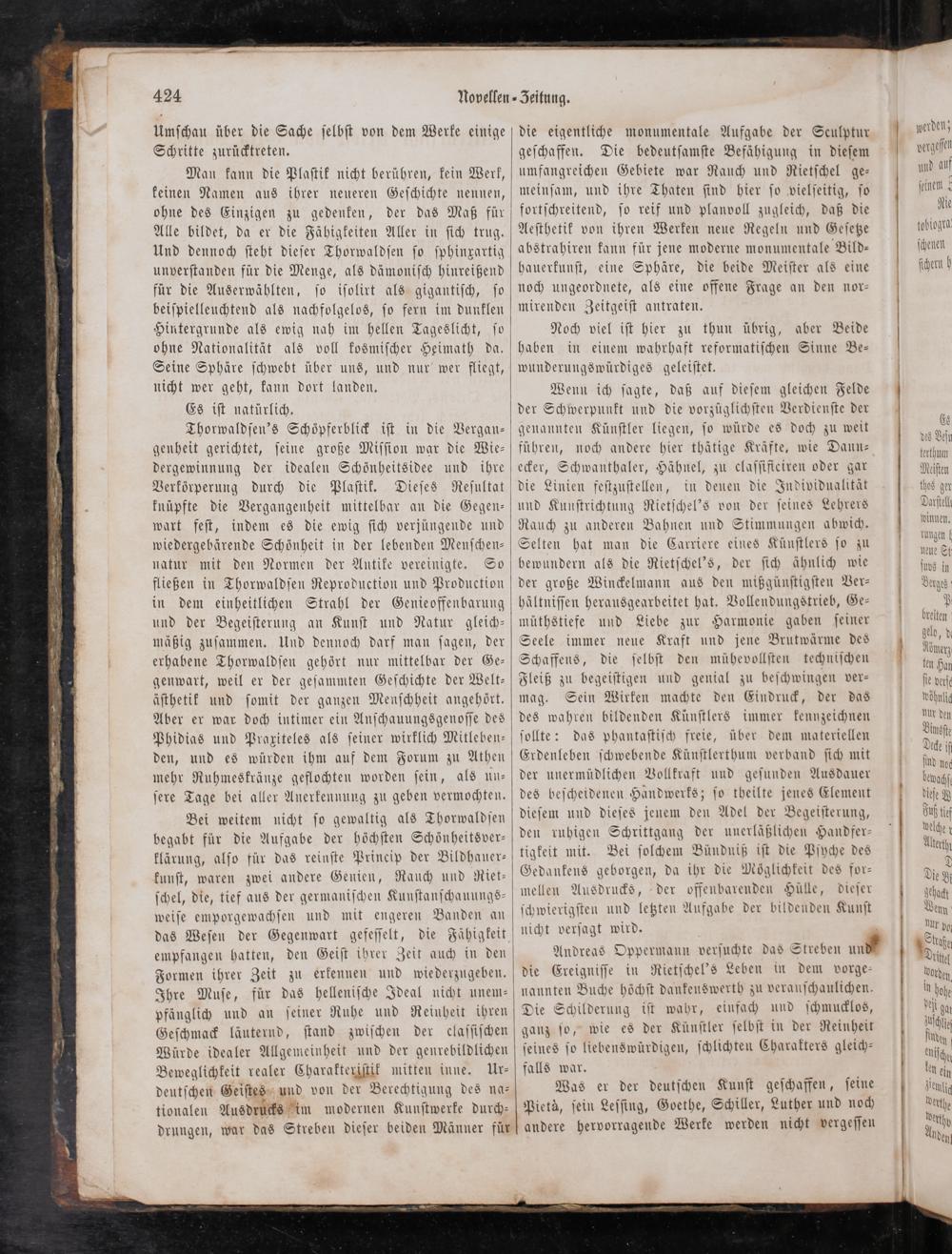 Bei weitem nicht ſo gewaltig als Thorwaldſen begabt für die Aufgabe der höchſten Schönheitsver⸗ klärung, alſo für das reinſte Princip der Bildhauer⸗ kunſt, waren zwei andere Genien, Rauch und Riet⸗ ſchel, die, tief aus der germaniſchen Kunſtanſchauungs⸗ weiſe emporgewachſen und mit engeren Banden an das Weſen der Gegenwart gefeſſelt, die Faͤhigkeit empfangen hatten, den Geiſt ihrer Zeit auch in den