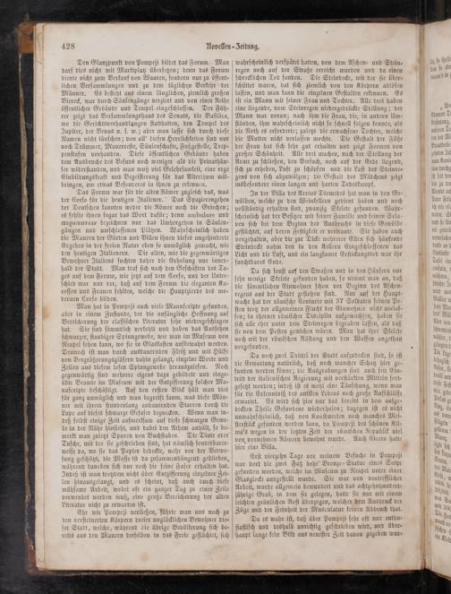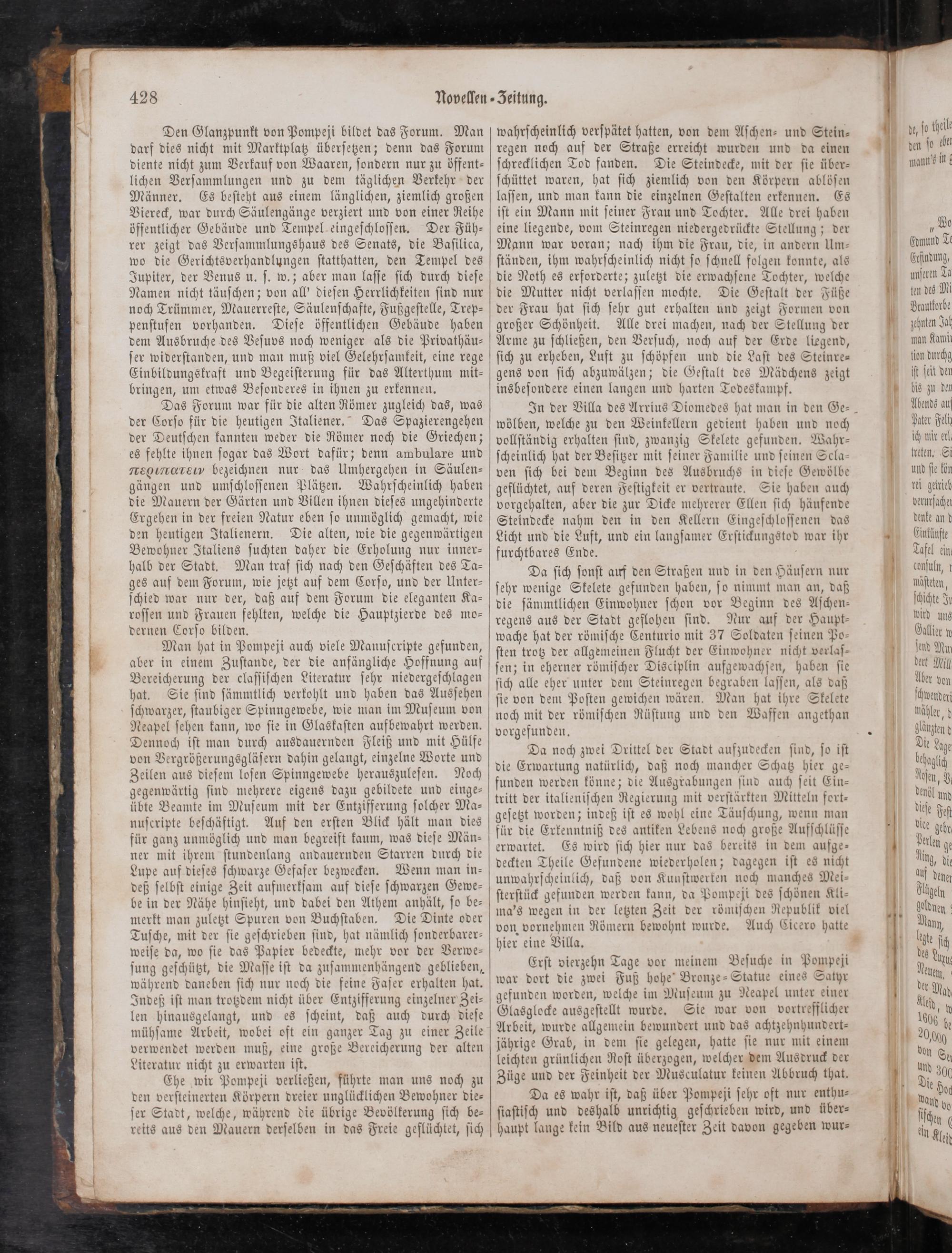 Man hat in Pompeji auch viele Manuſcripte gefunden, aber in einem Zuſtande, der die anfängliche Hoffnung auf Bereicherung der claſſiſchen Literatur ſehr niedergeſchlagen hat. Sie ſind ſämmtlich verkohlt und haben das Ausſehen ſchwarzer, ſtaubiger Spinngewebe, wie man im Muſeum von Neapel ſehen kann, wo ſie in Glaskaſten aufbewahrt werden. Dennoch iſt man durch ausdauernden Fleiß und mit Hülfe von Vergrößerungsgläſern dahin gelangt, einzelne Worte und Zeilen aus dieſem loſen Spinngewebe herauszuleſen. Noch gegenwärtig ſind mehrere eigens dazu gebildete und einge⸗ übte Beamte im Muſeum mit der Entzifferung ſolcher Ma⸗ nuſcripte beſchäftigt. Auf den erſten Blick hält man dies für ganz unmöglich und man begreift kaum, was dieſe Män⸗ ner mit ihrem ſtundenlang andauernden Starren durch die Lupe auf dieſes ſchwarze Gefaſer bezwecken. Wenn man in⸗ deß ſelbſt einige Zeit aufmerkſam auf dieſe ſchwarzen Gewe⸗ be in der Nähe hinſieht, und dabei den Athem anhält, ſo be⸗ merkt man zuletzt Spuren von Buchſtaben. Die Dinte oder Tuſche, mit der ſie geſchrieben ſind, hat nämlich ſonderbarer⸗ weiſe da, wo ſie das Papier bedeckte, mehr vor der Verwe⸗ ſung geſchützt, die Maſſe iſt da zuſammenhängend geblieben, während daneben ſich nur noch die feine Faſer erhalten hat. Indeß iſt man trotzdem nicht über Entzifferung einzelner Zei⸗ len hinausgelangt, und es ſcheint, daß auch durch dieſe mühſame Arbeit, wobei oft ein ganzer Tag zu einer Zeile verwendet werden muß, eine große Bereicherung der alten Literatur nicht zu erwarten iſt.