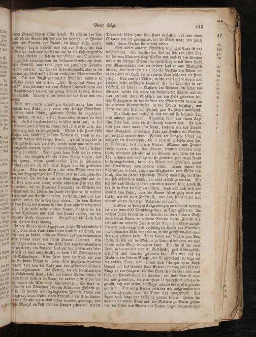 Noch vieler anderer Menſchen tragiſches Ende iſt uns wohlbekannt. Ein Prieſter der Iſis ſah ſich von allen Sei⸗ ten her von Flammen eingeſchloſſen und auch in den Straßen wallte ein feuriger Strom; da durchſchlug er mit einer Hacke zwei Mauerwände; vor der dritten ſank er aus Mattigkeit nieder, oder weil ihm der glühheiße Brodem den Athem be— nahm; aber die Hacke hat er auch im Tode nicht aus der Hand gelegt. Und nun die Thiere, welche angebunden waren und deshalb nicht entfliehen konnten! So der Mauleſel in der Bäckerei, die Pferde im Gaſthofe des Albinus, die Ziege des Siricus, welche ſich unter den Küchenheerd flüchtete und die man dort mit einem Glöckchen um den Hals gefunden hat. Die Gefangenen in der Kaſerne der Gladiatoren waren an die eiſernen Klammerhaken in der Mauer befeſtigt, und ihnen war alſo ſelbſt ein Verſuch zum Entfliehen unmöglich.