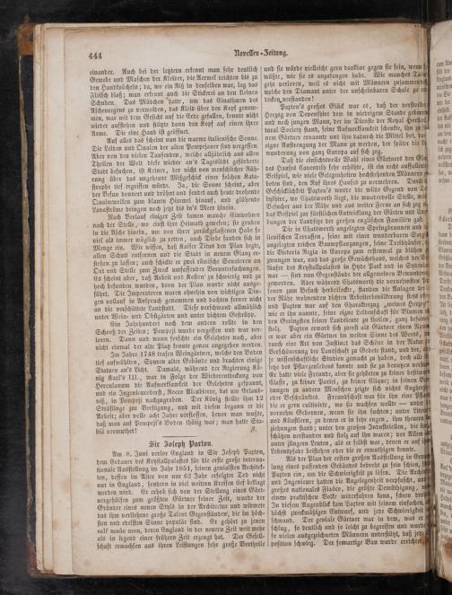 Daß die einſichtsvolle Wahl eines Gärtners den Glu des Hauſes Cavendiſh ſehr erhöhte, iſt ein recht auffallendet Beiſpiel, wie viele Gelegenheiten hochſtehenden Männern boten ſind, den Ruf ihres Hauſes zu vermehren. Durch u Geſchicklichkeit Paxton's wurde die wilde Gegend von Der byſhire, wo Chatsworth liegt, die wundervolle Stelle, welt Beſucher aus der Nähe und aus weiter Ferne an ſich zog un das Beiſpiel zur fürſtlichen Entwicklung der Gärten und Uns bungen der Landſitze der großen engliſchen Familien gab.