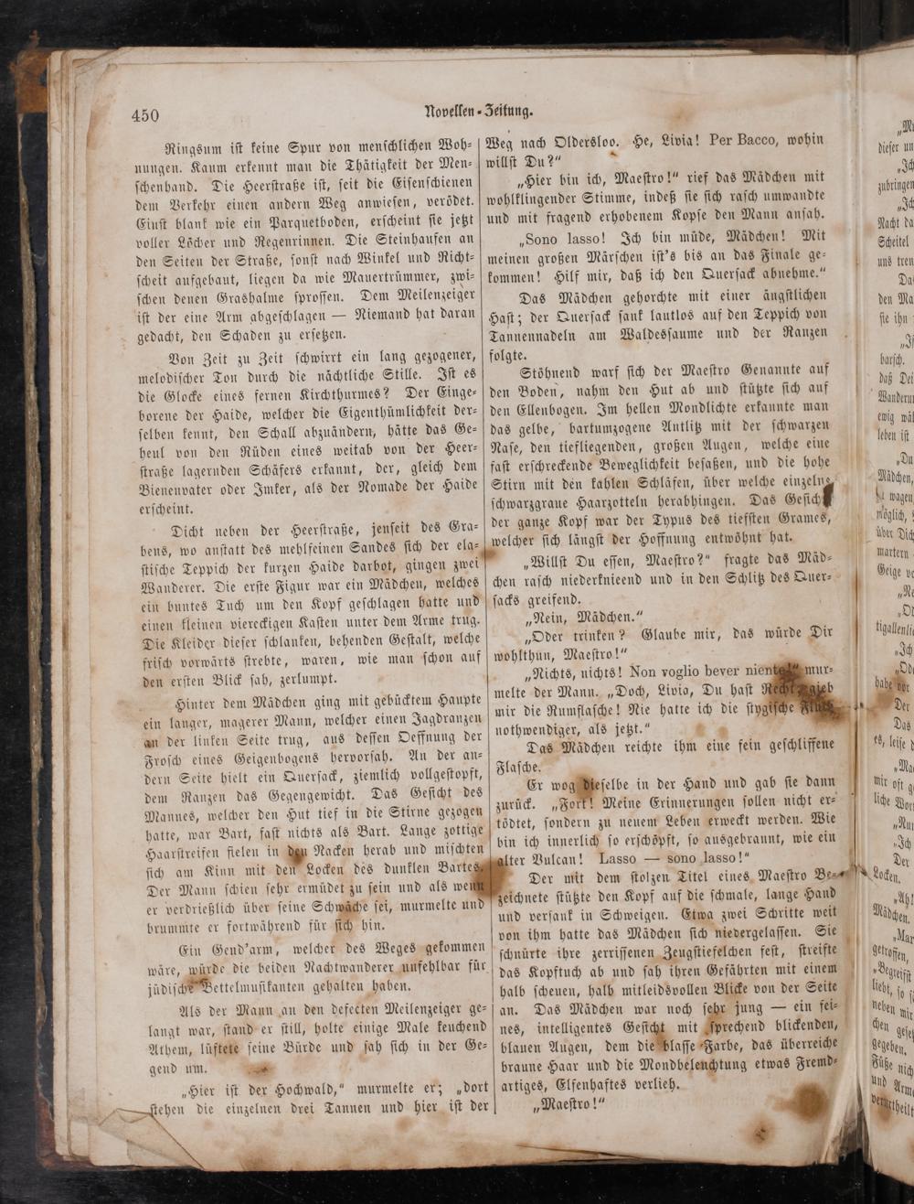 tödtet, ſondern zu neuem Leben erweckt werden. Wie bin ich innerlich ſo erſchöpft, ſo ausgebrannt, wie ein ter Vulcan! Lasso— sono lasso!“ Der mit dem ſtolzen Titel eines Maeſtro Be⸗ eichnete ſtützte den Kopf auf die ſchmale, lange Hand und verſank in Schweigen. Etwa zwei Schritte weit von ihm hatte das Mädchen ſich niedergelaſſen. 9 ſchnürte ihre zerriſſenen Zeugſtiefelchen feſt, ſtreifte das Kopftuch ab und ſah ihren Gefährten mit einem halb ſcheuen, halb mitleidsvollen Blicke von der Seite ⸗[an. Das Mädchen war noch ſehr jung— ein fei⸗ intelligentes Geſicht mit 4 ⸗ blauen Augen, dem die blaſſe Farbe, das überreiche braune ſan und die Mondbeleuchtung etwas Jremd⸗ Elfenhaftes verlieh. Maeſtro!“
